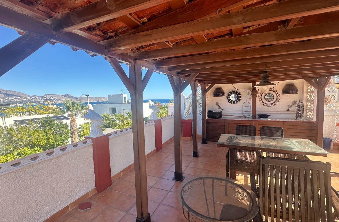 This house consists of two apartments. The entrance on the street gives access to a small garden where a separate staircase goes to the apartment on the first floor. The ground floor apartment has a garden, the first floor apartment a real roof terrace with a spectacular view. Both apartments have one bedroom, bathroom, salon and kitchen. The apartment on the first floor has the possibility for a second bedroom as this is now used to have a bigger living room. On the streetside is also a garage/ storage. This could be your investment property to rent out. Make your calculations and take into account there is no community fee to pay!!