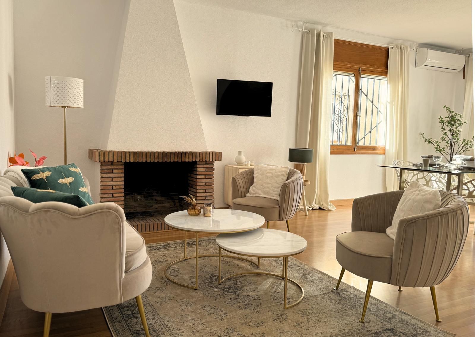 The apartment offers approximately 80 m² of living space and features a bright and spacious open-plan living and dining area with air conditioning and a cosy wood-burning fireplace. The kitchen is connected to the living area via a serving hatch, creating a sociable layout that is both practical and functional.