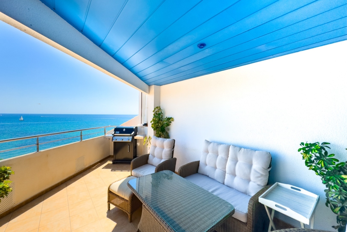 Luxury penthouse for sale in Altea, located in a first-line building just steps from the beach. The 118 m² apartment features 3 bedrooms, including a master with a private terrace overlooking Altea’s old town. The open-plan living and dining area opens onto a spacious terrace with Mediterranean Sea views. Modern kitchen with high-quality appliances, central air conditioning and heating, built-in wardrobes, and elevator access. Sold fully finished and ready to move in. No private parking but excellent public parking nearby. Ideal coastal home with easy access to local amenities.