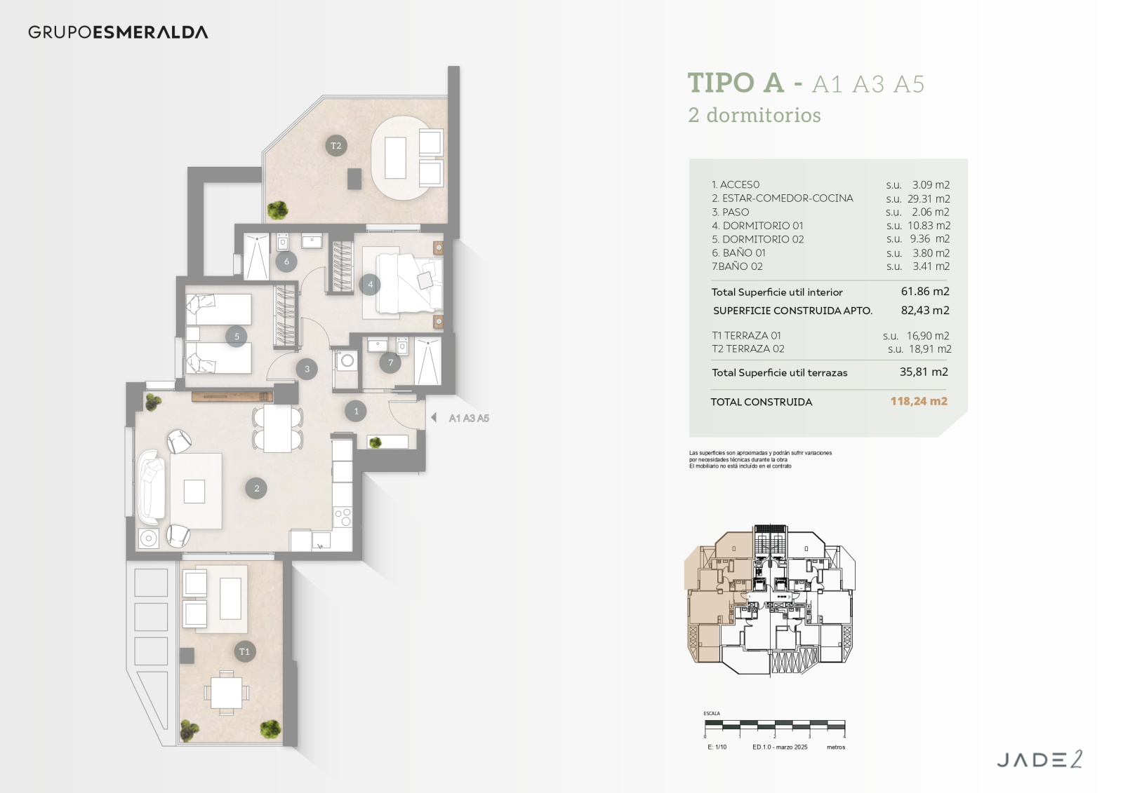 The project focuses on high energy efficiency with thermally and acoustically insulated walls and hot water supplied by an aerothermal system. In addition, there is the option of customising the apartment with personalisation options such as different floor coverings, kitchen worktops, wall colours, bathroom cladding and upgrades for air conditioning (Airzone) and smart home systems.