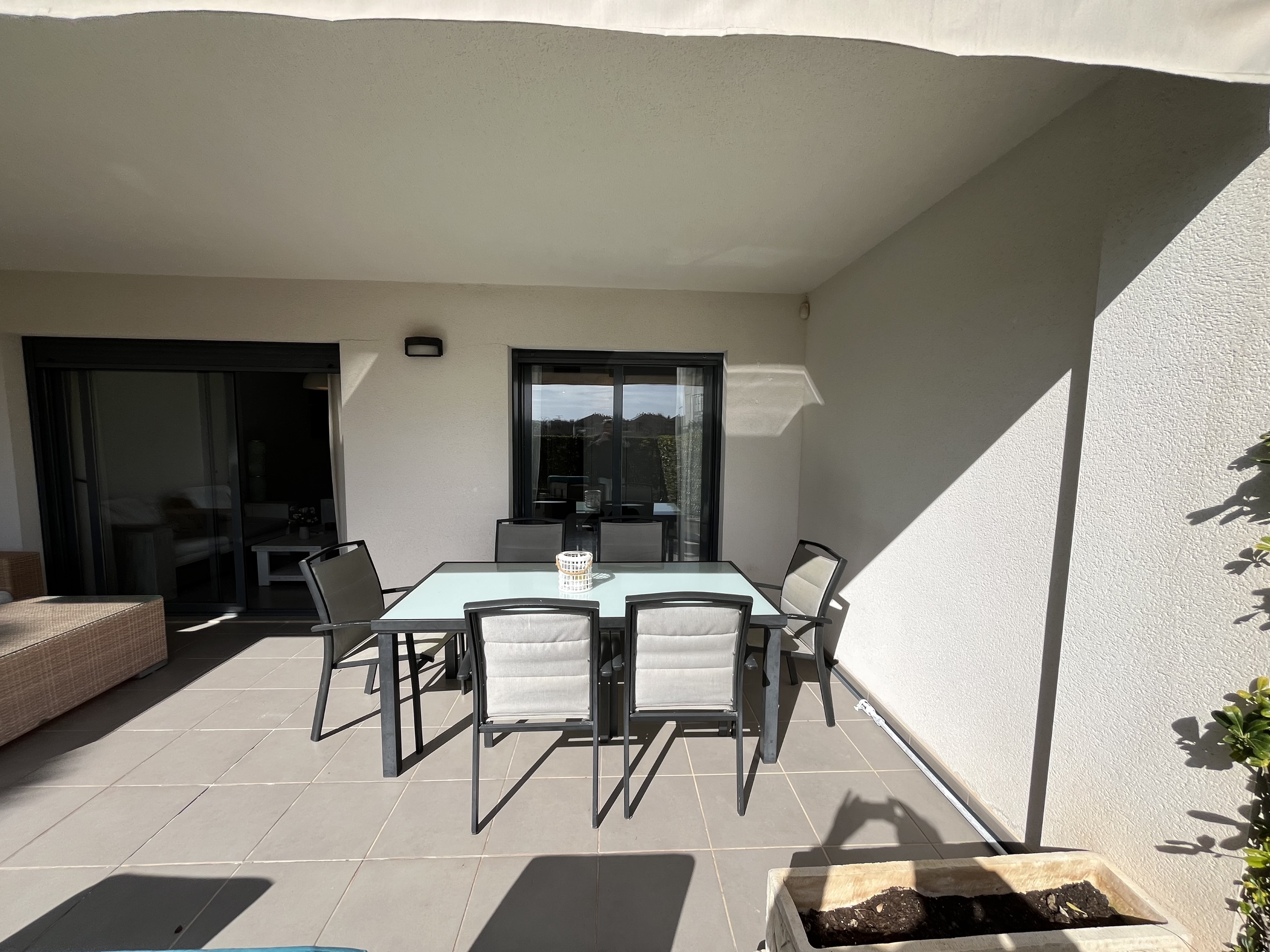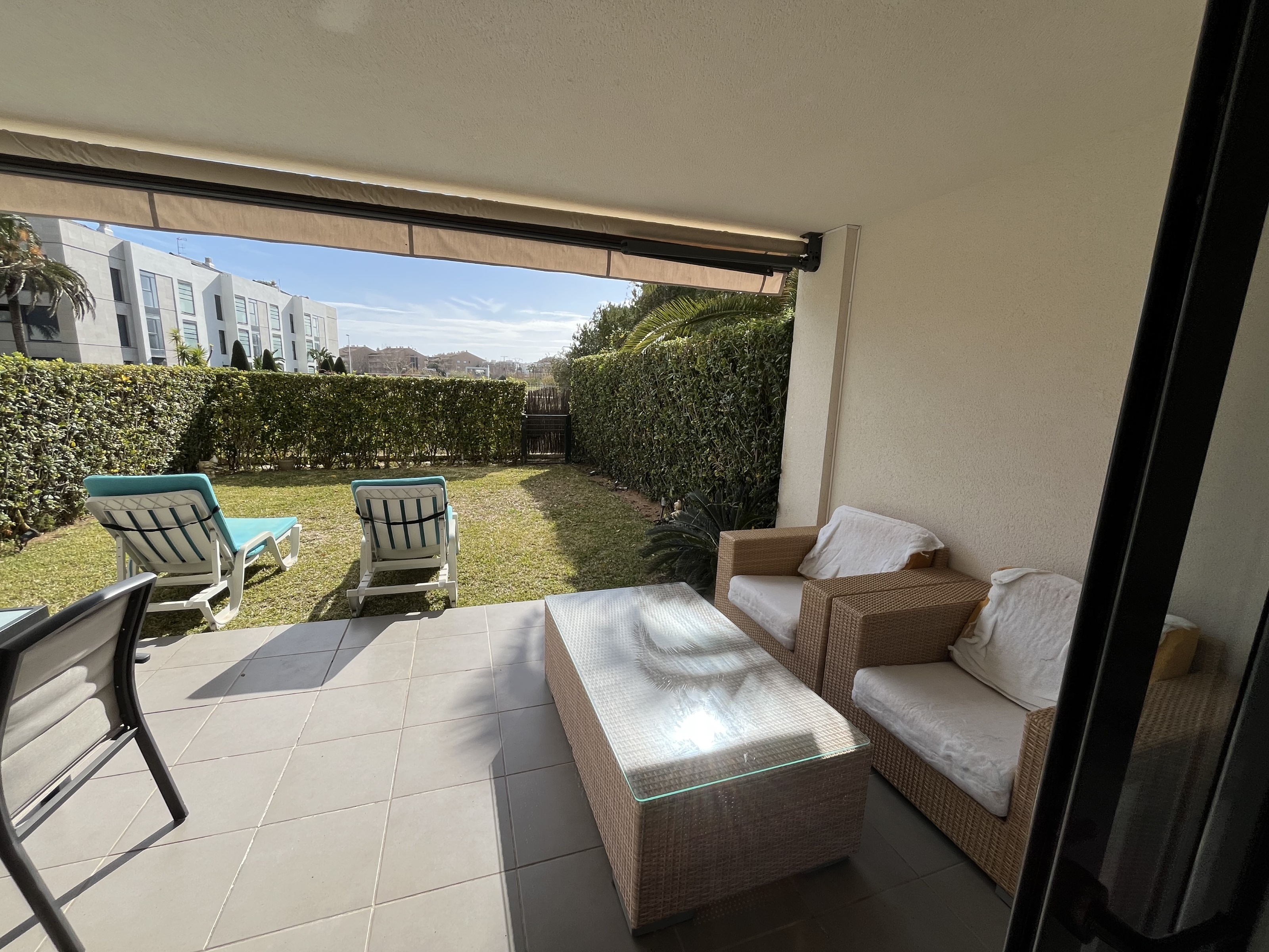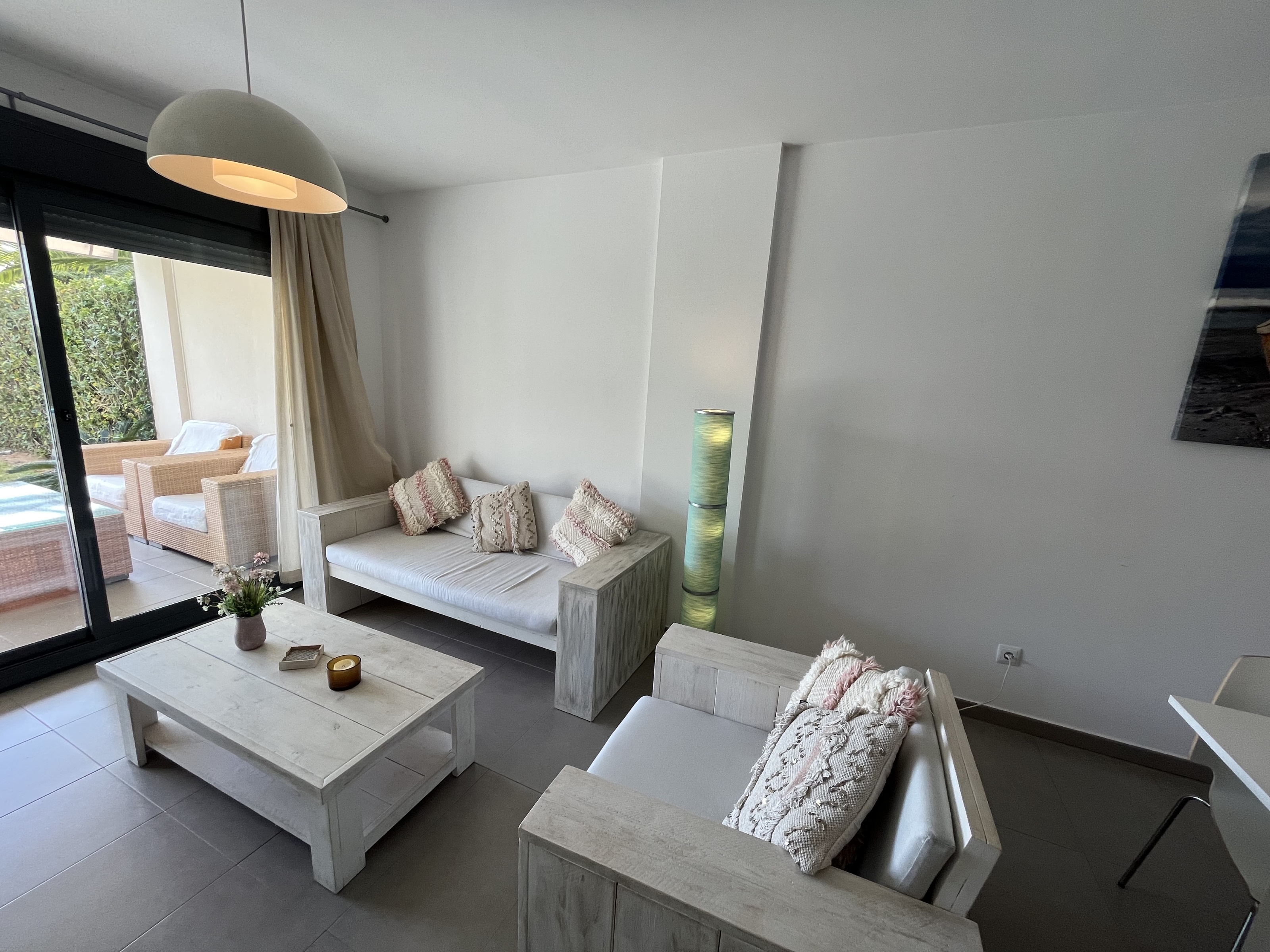 The bright living room opens directly onto a private garden, perfect for outdoor dining or relaxing in the sun all year round. Residents enjoy access to a large communal swimming pool, located in well-maintained communal grounds.