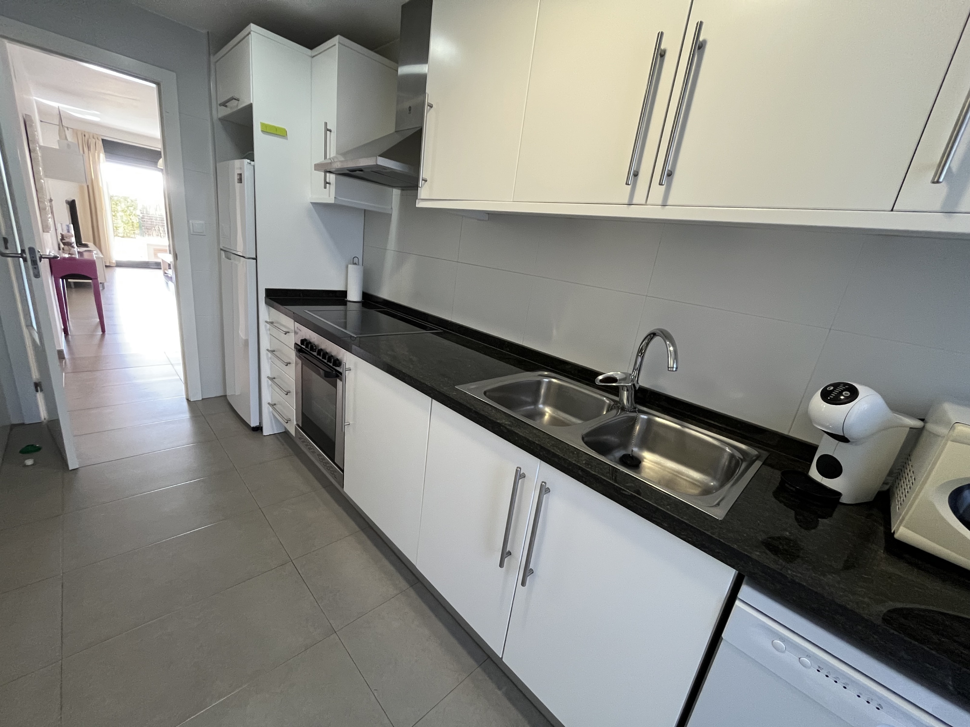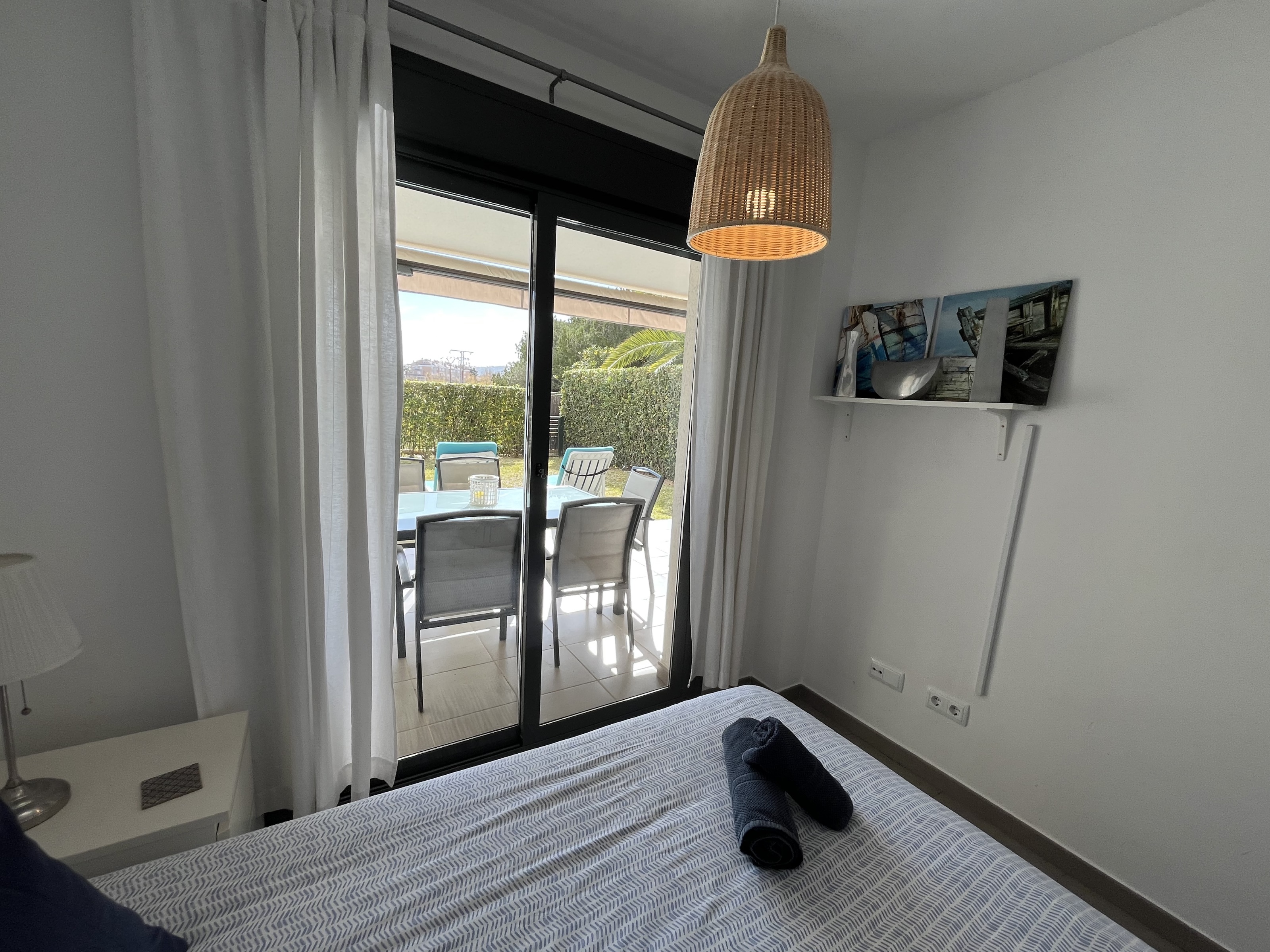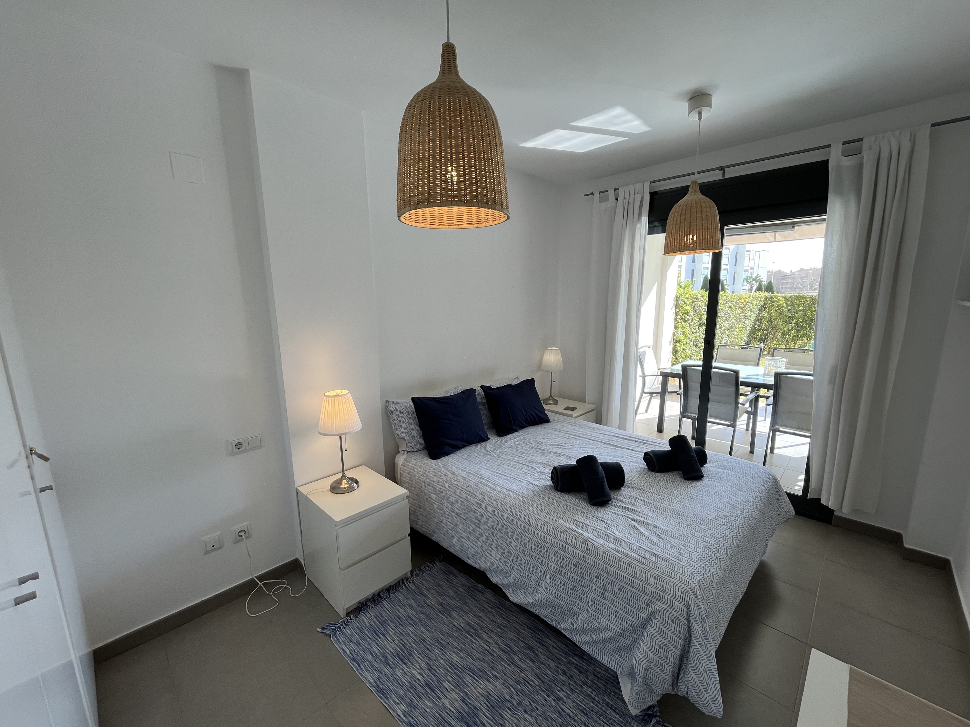 The bright living room opens directly onto a private garden, perfect for outdoor dining or relaxing in the sun all year round. Residents enjoy access to a large communal swimming pool, located in well-maintained communal grounds.