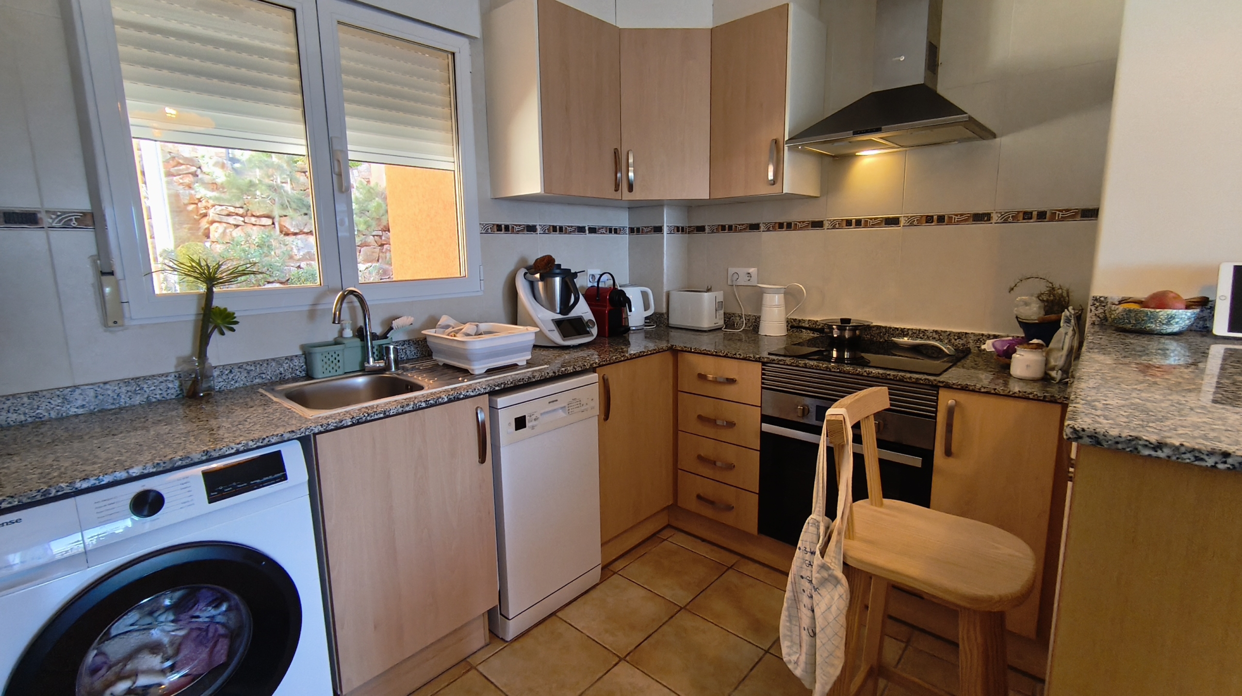 Air conditioning (hot/cold), fully fitted kitchen with electrical appliances including dishwasher and washing machine, built-in wardrobes, satellite TV, Wi-Fi, automatic entrance gate, 24/7 La Sella security.