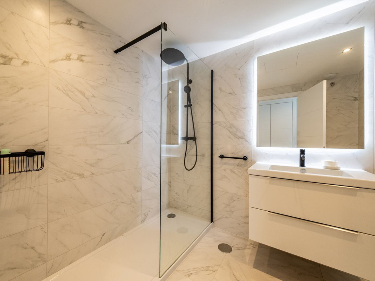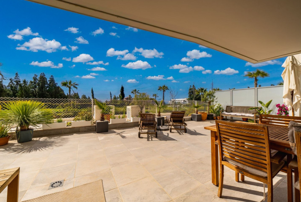 The terrace is where the property truly opens up. Spanning fifty square metres and facing south, it becomes a private outdoor extension of the home, catching the sun from morning to evening. From here, the views stretch across the gardens and pool, with the sea appearing in the distance. It’s a space that naturally invites slow mornings, outdoor meals and relaxed evenings, giving the apartment a strong sense of Mediterranean living.