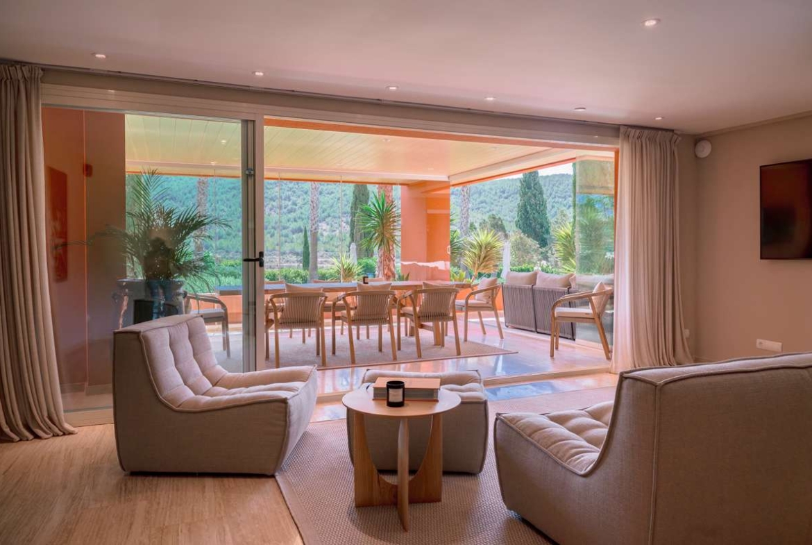 A Peaceful Oasis Between Golf, Nature, and the SeaNestled among the rolling, pine-covered hills of Ibiza’s east coast lies Roca Llisa—one of the island’s most prestigious and sought-after residential communities. This gated and secure enclave offers a serene atmosphere that invites instant relaxation. The stylish apartment now for sale is set in an exceptional location where peace, privacy, and comfort take center stage. Ideally situated between the lively Ibiza Town and the charming Santa Eulalia—both just 10 minutes away by car—you’ll enjoy the tranquility of nature without sacrificing access to beaches, restaurants, boutiques, or the island’s vibrant nightlife.A standout feature of this community is its direct access to Ibiza’s only golf course—an absolute dream for golf enthusiasts. At the same time, the surrounding nature offers endless opportunities for walking, cycling, or simply soaking in the views and the Mediterranean climate. Roca Llisa is designed to deliver the very best of the island: a harmonious blend of luxury living, natural beauty, and convenient accessibility. It’s the ideal choice for those seeking a safe, peaceful, and upscale environment where the true Ibiza spirit thrives.Smartly Designed, Stylishly Finished, and Full of SpaceThe apartment features a generous and well-thought-out layout with approximately 160 m² of interior living space (excluding terraces, winter garden, storage, and parking). With four bedrooms and four bathrooms, this home is perfect for families, hosting guests, or combining work and living. The master bedroom, about 15.5 m², is a peaceful retreat complete with a spacious 8.5 m² en-suite bathroom finished with high-quality materials. The other bedrooms—measuring approx. 14.5 m², 11.2 m², and a compact but functional 5 m² room (ideal as a child’s room, guest space, or staff quarters)—each come with their own bathroom, ensuring optimal privacy and convenience.At the heart of the home is a bright, open-plan living area that flows naturally between lounging, cooking, and dining. The 31.5 m² living room is connected to a spacious kitchen and seating area of approx. 55 m², fully equipped for modern living with plenty of space for a large dining table, a cozy lounge corner, and a contemporary kitchen layout with an island or bar—perfect for long dinners and entertaining.Practicality has also been carefully considered: a separate laundry room of around 8 m² offers ample space for washer, dryer, and storage. The apartment also includes a private garage box of approx. 10 m², an additional storage area, and a private parking space of approx. 12 m². Every detail in this home radiates comfort and quality—move-in ready.Sun, Greenery, and Outdoor Luxury—All Year RoundThrough the large sliding doors, the living space extends to a covered terrace of around 30 m²—an inviting winter garden perfect for long evenings or shaded summer lunches. Beyond that lies a 40 m² sun-drenched terrace with beautiful views of the green surroundings and nearby mountains. Residents of the complex also enjoy access to a beautifully landscaped communal pool, surrounded by palm trees and lush lawns—ideal for cooling off and unwinding.This home is the perfect choice for those seeking luxury, space, and tranquility in a secure community, with all the amenities of modern island living. Contact Dream Propertiestoday for more information or to schedule a viewing—this is Ibiza at its finest.