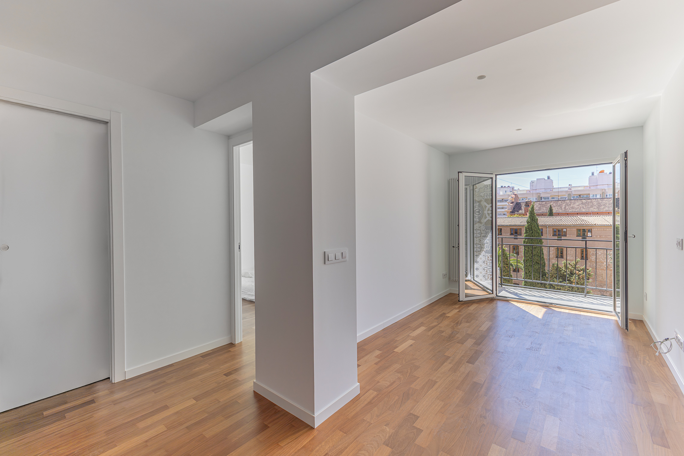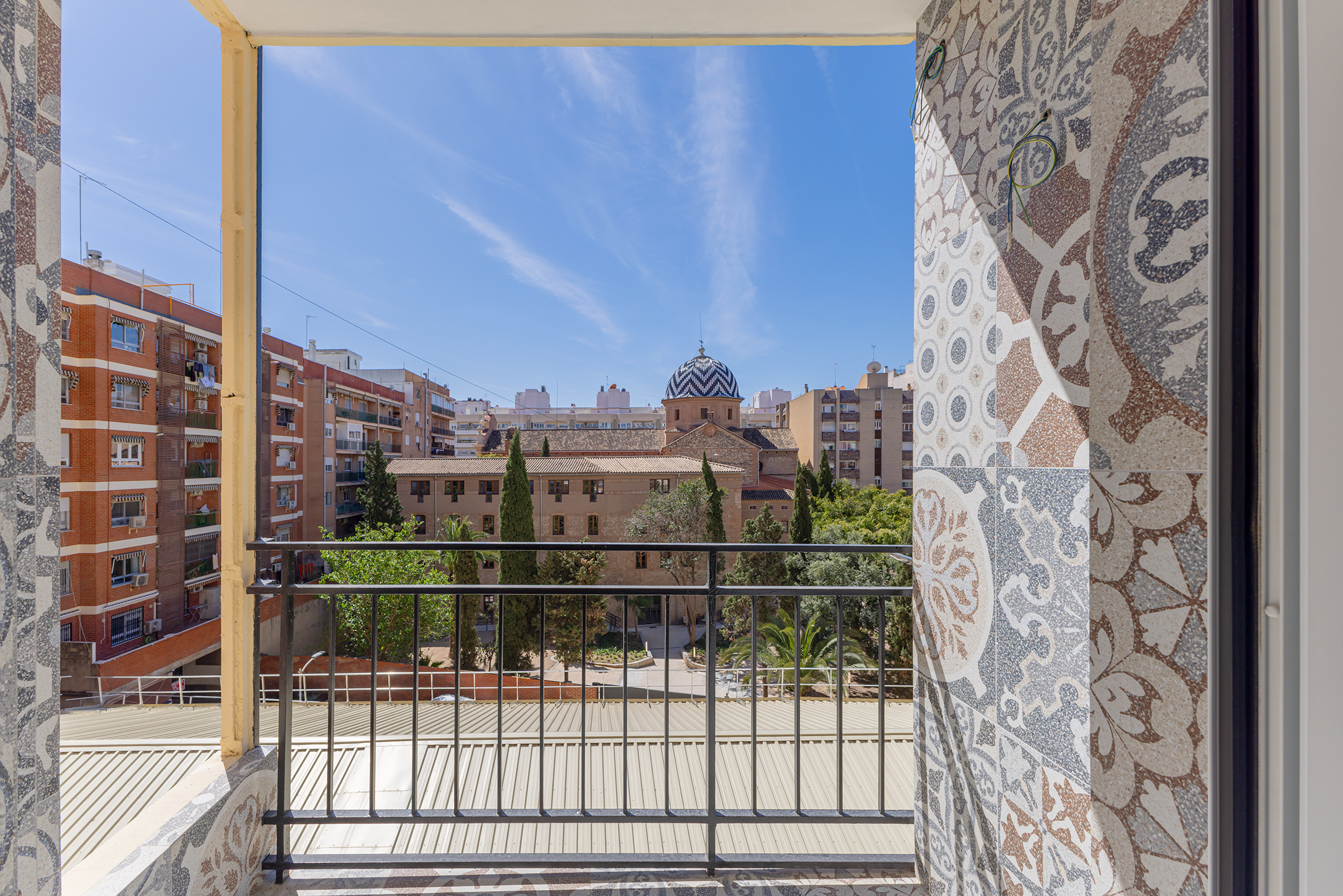 Located in the Trinitat neighbourhood, just a few minutes’ walk from the Turia Gardens and the Viveros Gardens, this apartment has a floor area of 60 m², according to the land registry. The property is situated on the fourth floor of a building constructed in 1967, which has a lift and an entrance hall adapted for people with reduced mobility. The apartment faces the inner courtyard but stands out for its excellent natural light and pleasant views of the gardens of the Parish Church of Nuestra Señora del Carmen.