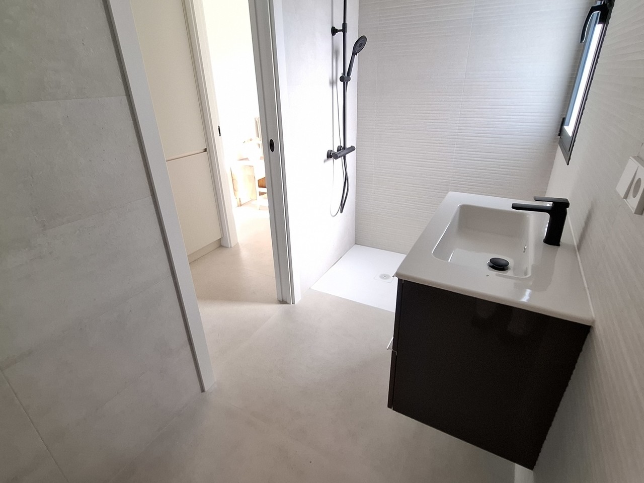 Rectified porcelain tile glued with adhesive will be placed in the interior, exterior and bathrooms. See the dossier Porcelanosa