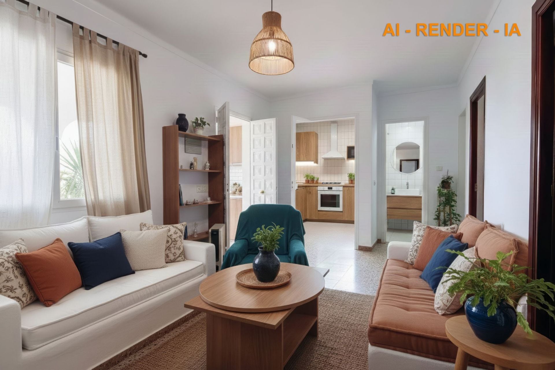 The house is arranged on a single level and features a roof terrace accessible via exterior stairs. Inside, the layout includes a living-dining room, kitchen, bathroom, two bedrooms, plus a third room currently used for storage, along with an additional internal storage room.
