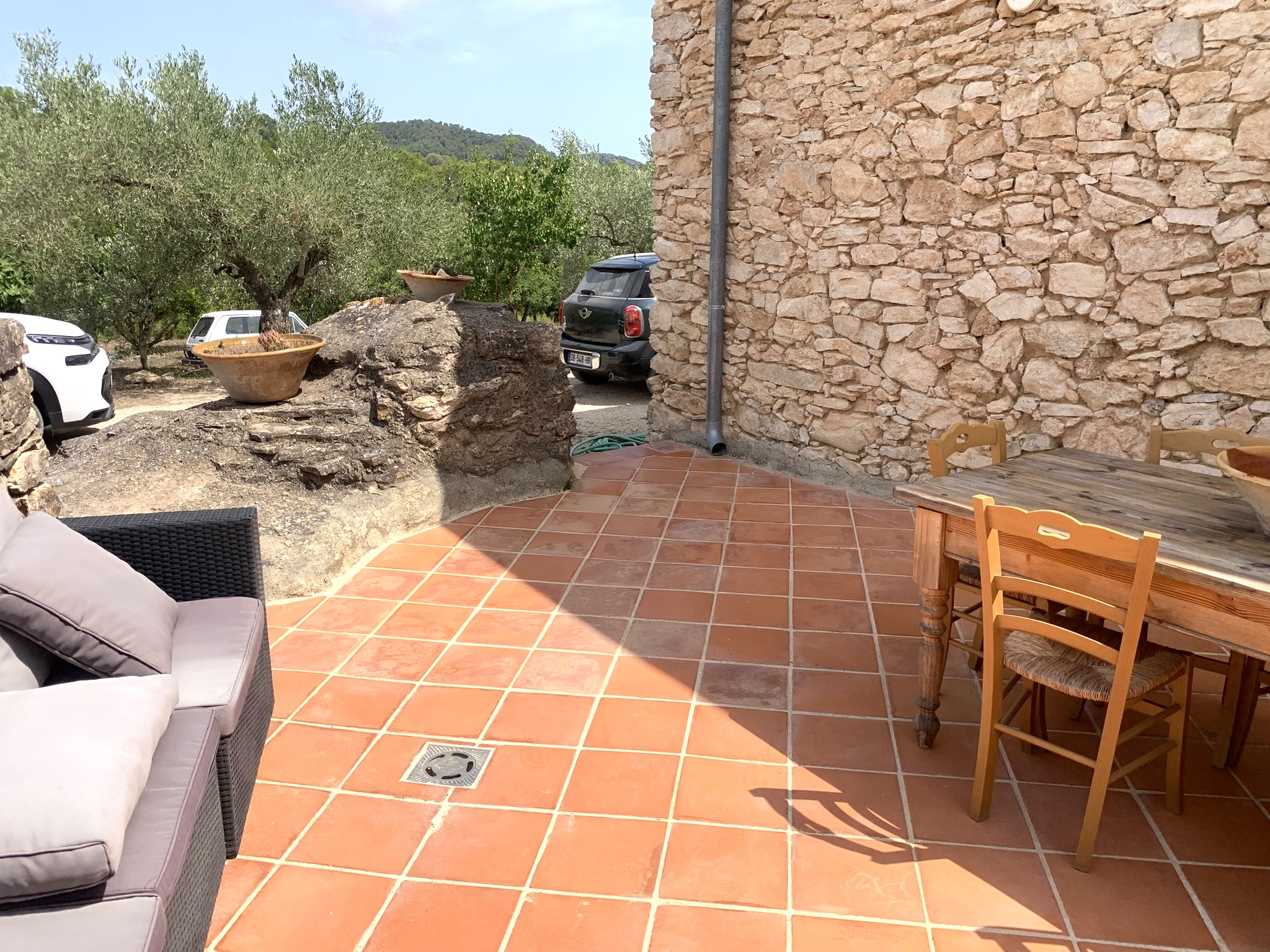 From the kitchen, step out to a sun-drenched terrace, perfect for entertaining. The front gravelled courtyard provides additional space for gatherings under the stars. The land is adorned with mature olive trees, shady terraces, and a charming wooden storage shed. An area has been prepared for an above-ground pool, should you wish to add one.