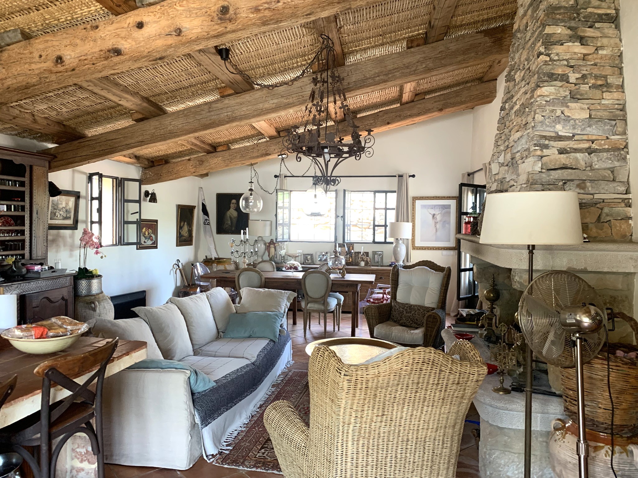 Step into a stunning open-plan kitchen, lounge, and dining area, where original treated wooden beams and traditional cane matting ceilings capture the soul of a true country masia. The impressive stone fireplace and rustic floor tiles radiate warmth and authenticity. Patio doors at both ends open seamlessly to a rear tiled terrace for relaxed dining or a front gravelled seating area for sunny morning coffees.