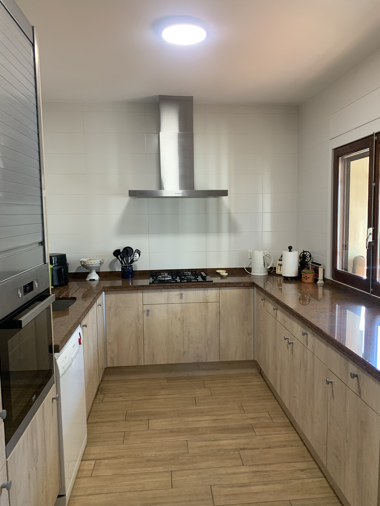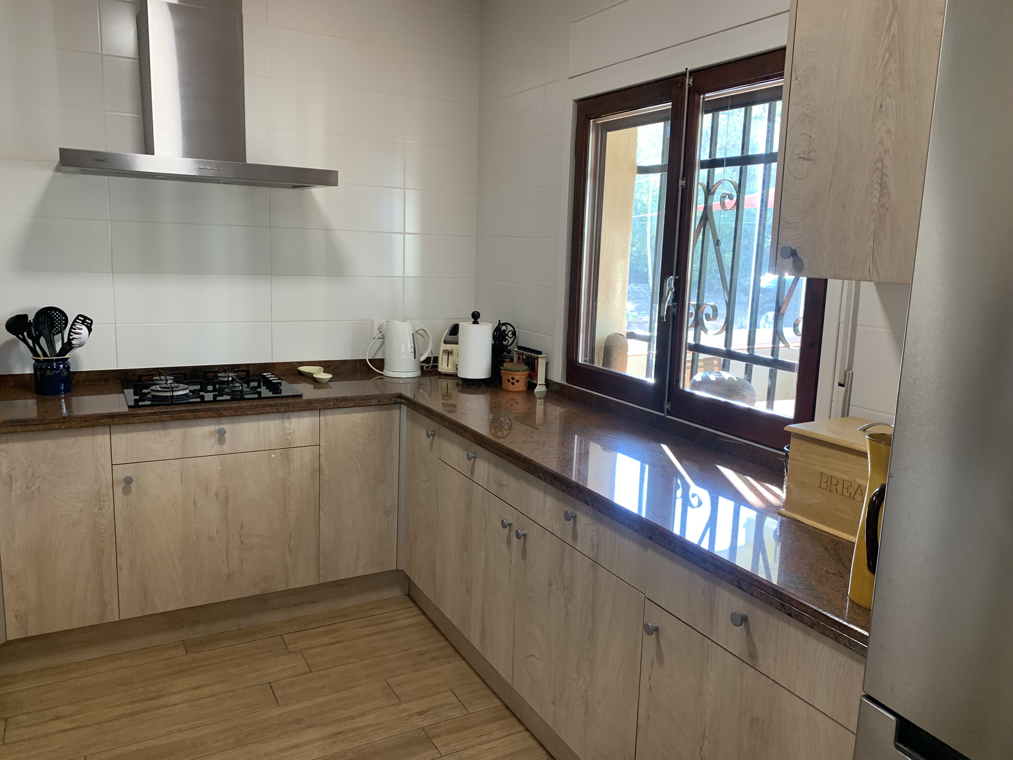The separate, fully fitted kitchen is equipped with elegant granite countertops, perfect for preparing home-cooked meals.