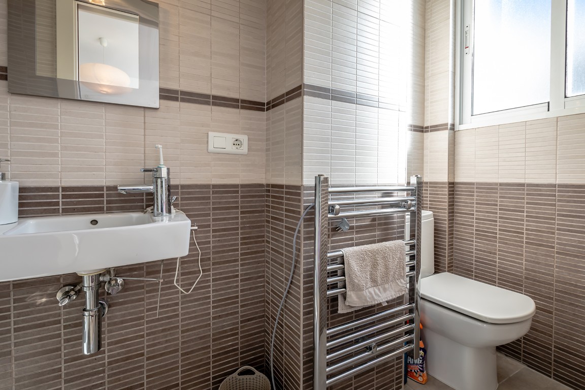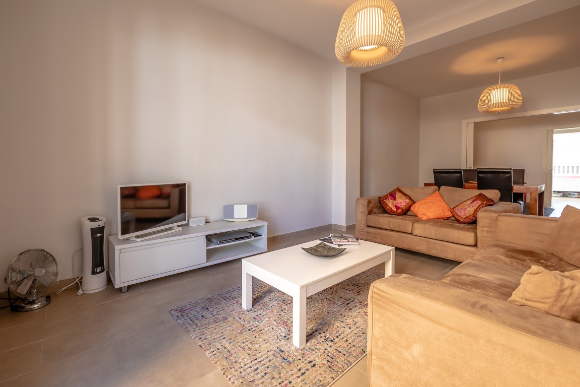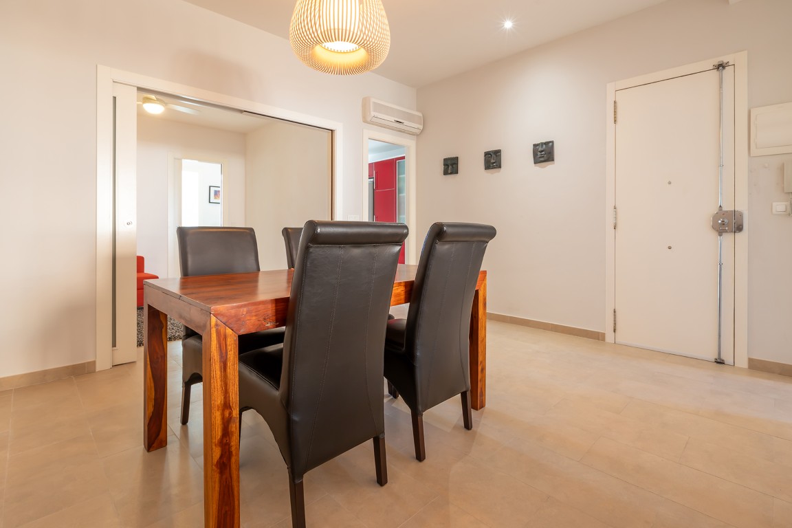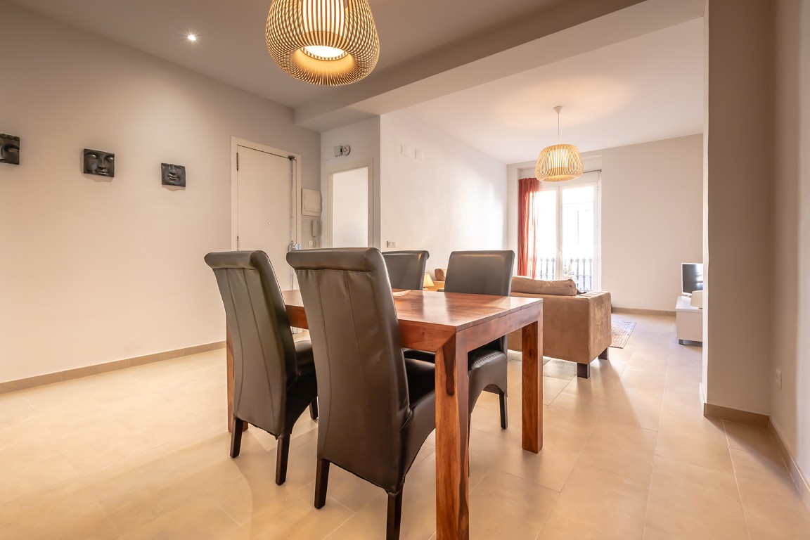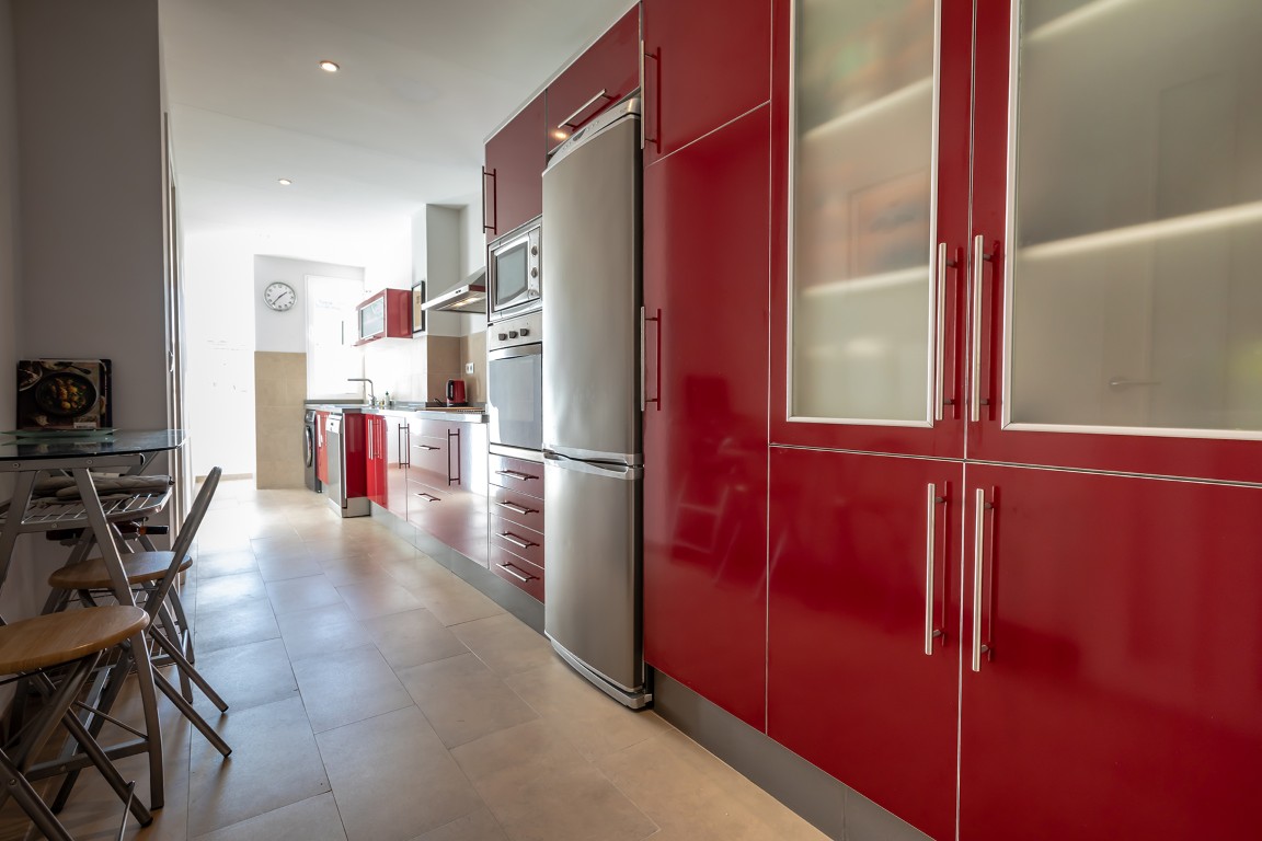 The apartment has a practical layout and feels pleasantly spacious thanks to an additional intermediate room, currently used as a cosy TV room. This space can easily be adapted as a home office or extra guest bedroom. The living room is bright and generous, while the kitchen is notably spacious and designed for comfortable everyday living. The balcony on the street side offers a small but charming outdoor space — perfect for starting the day with a café con leche, or simply picking one up from the bar across the street.