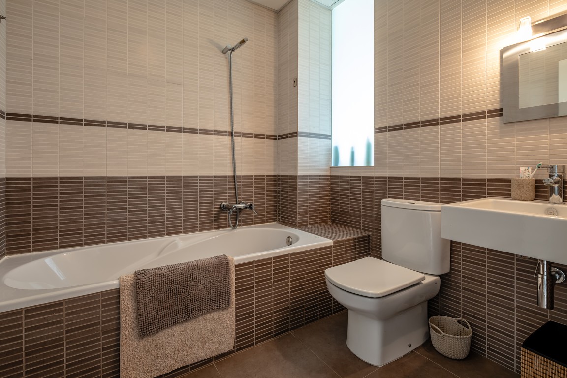 The property features two bedrooms and two bathrooms. The main bedroom is located at the quiet rear of the building and includes an en-suite bathroom with washbasin, shower and toilet. The second bathroom is fitted with a washbasin, toilet and bathtub. The second bedroom is positioned at the front of the apartment, enjoying plenty of natural light and a lively street atmosphere.