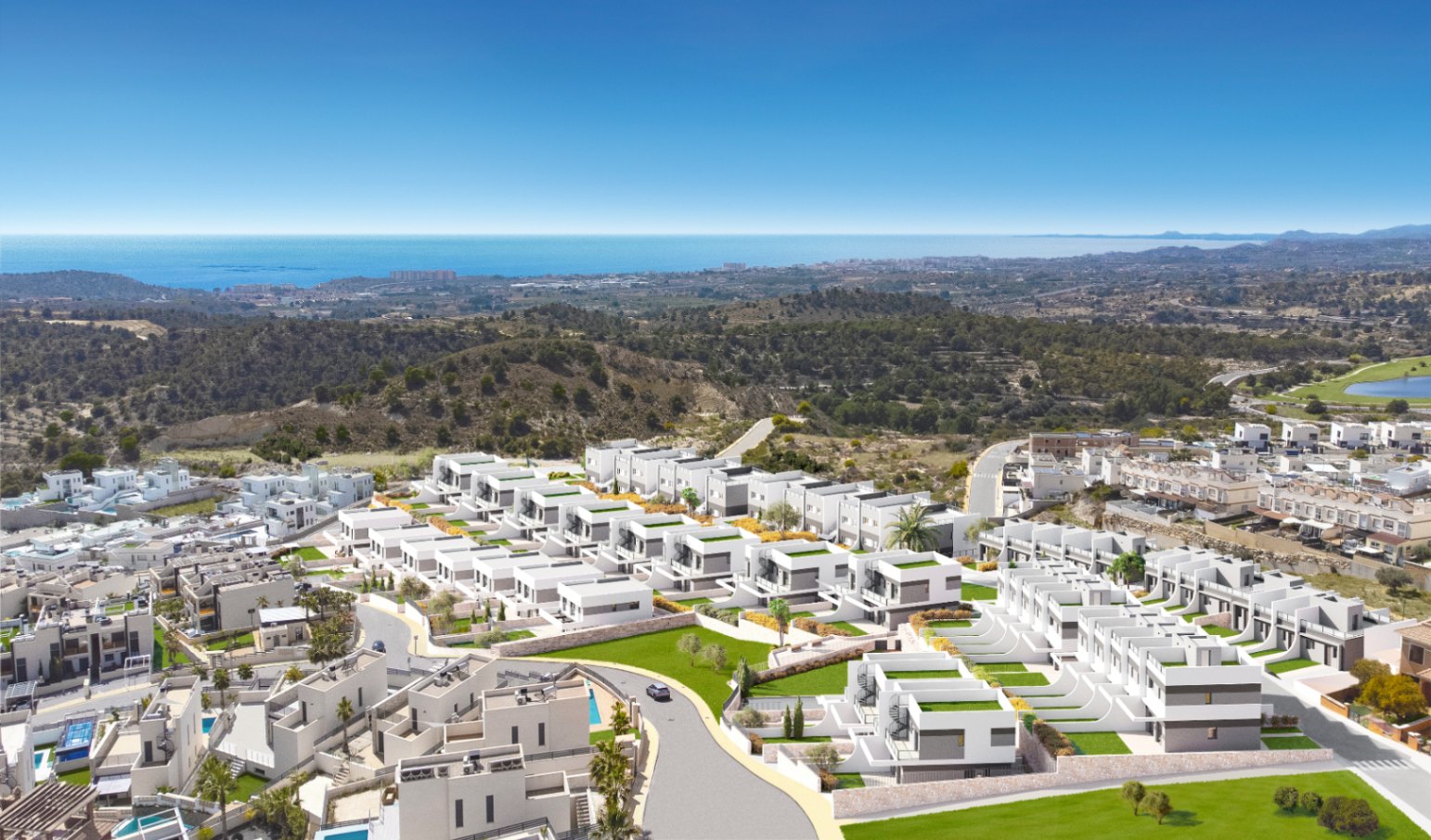 New development of 10 semi-detached properties in one of the most privileged areas of Finestrat. It is a very quiet area, but at the same time well communicated and close to all services, as well as having the golf course, the beaches and Benidorm within walking distance.