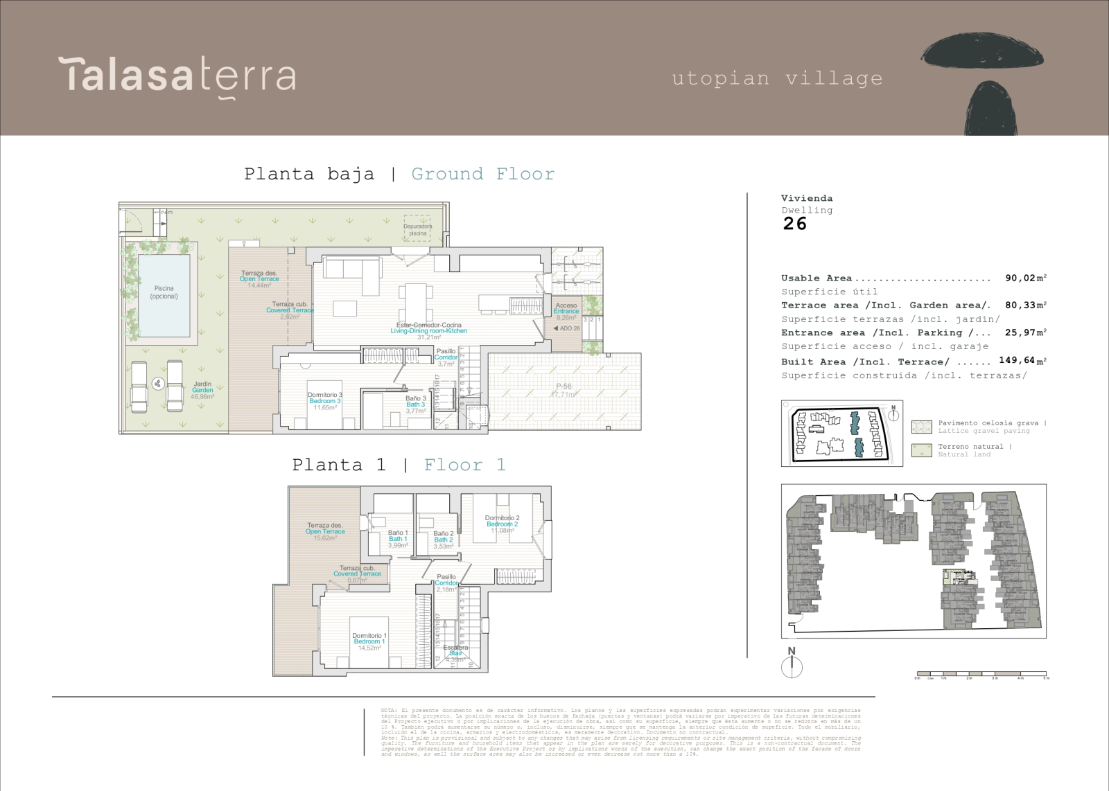 High-quality aluminium windows and patio doors with thermal break and double glazing with ‘Climalit’ type chamber. Motorised blinds in the bedrooms. Security roller shutters on the ground floor of the terraced houses. The parking spaces are covered by pergolas. Pre-installation for charging electric vehicles in accordance with regulations. Complete installation of air conditioning via ducts with heat and cold pump. Control thermostat in the living-dining room. Hot water supply via aerothermal system.