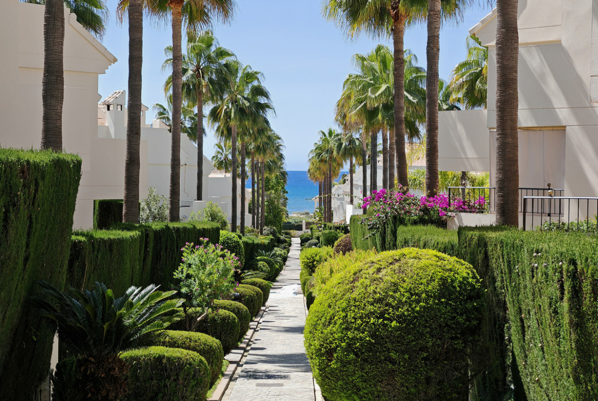 Town House for sale in Las Chapas, Marbella with 3 bedrooms, 2 bathrooms, 1 on suite bathroom, 1 toilet and with orientation south, with communal swimming pool, private garage (3 parking spaces) and private garden. Regarding property dimensions, it has 228 m² built and 40 m² terrace. Has the following facilities amenities near, transport near, air conditioning, marble floors, basement, guest room, storage room, solarium, security entrance, double glazing, guest toilet, private terrace, kitchen equipped, living room, sea view, security shutters, covered terrace, electric blinds, fitted wardrobes, gated community, garden view, beachside, close to children playground, close to sea / beach, close to golf, uncovered terrace, optional furniture, excellent condition, good condition, close to shops, close to town, close to schools, surveillance cameras and pets allowed.
