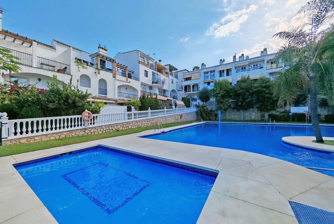 Town House for sale in , Mijas Costa with 3 bedrooms, 2 bathrooms, 1 on suite bathroom, 1 toilet and with orientation south/east, with communal swimming pool and communal garden. Regarding property dimensions, it has 154 m² built, 128 m² interior and 20 m² terrace. Has the following facilities amenities near, transport near, air conditioning, fully fitted kitchen, fireplace, marble floors, guest toilet, private terrace, living room, internet - wi-fi, fitted wardrobes, gated community, garden view, street view, close to children playground, glass doors, good condition, close to shops, close to schools and pets allowed.
