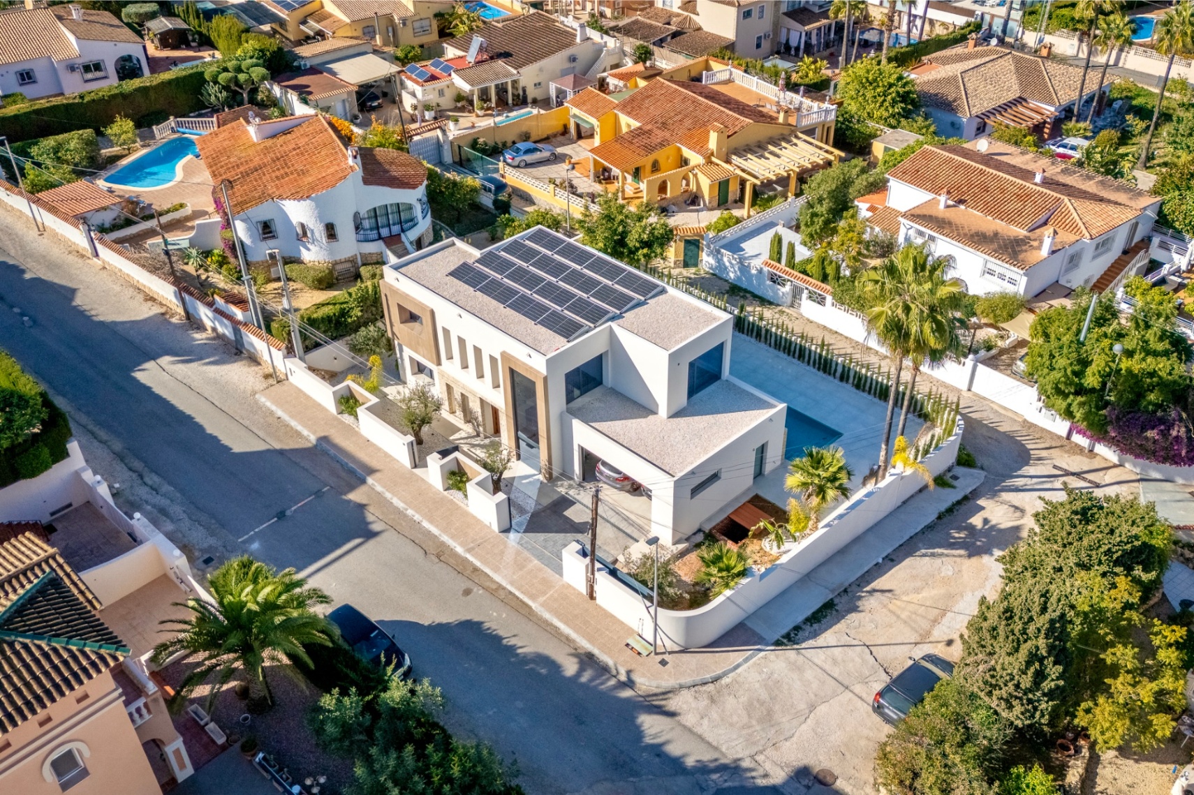 OpenPlan Designer Kitchen: A true focal point of the home, featuring an Americanstyle fridge, builtin wine cooler, and premium appliances—perfect for modern entertaining and culinary indulgence.4 Spacious Bedrooms: Each bedroom is ensuite, providing privacy, comfort, and convenience. The master suite features direct access to a sundrenched private terrace with breathtaking views over the Bay of Albir.Luxury Bathrooms & Finishes: Highspec fittings throughout, with underfloor heating and air conditioning ensuring yearround comfort.Exceptional Outdoor Living: A stunning saltwater pool with waterfall features anchors the beautifully landscaped garden—an idyllic setting for relaxation or entertaining guests.EnergyEfficient Living: Equipped with solar panels and advanced insulation for sustainable comfort.Garage & Parking: A secure, closed garage for two vehicles plus additional private parking.