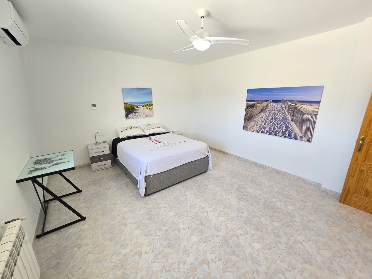 Adjacent to the bathroom is the large bright and airy double bedroom with a window enabling light to flood in. The room is large enough for numerous items of bedroom furniture plus a large bed. An air conditioning unit and a ceiling light with a fan enable climate control for the room.