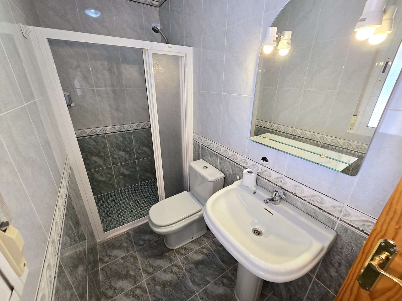 The first of these bedrooms is a good size with views over the pool area. It has a ceiling light with a fan for climate control. The en-suite bathroom, has a shower cubicle, W.C, hand basin and vanity mirror. The bathroom is tiled for easy maintenance.