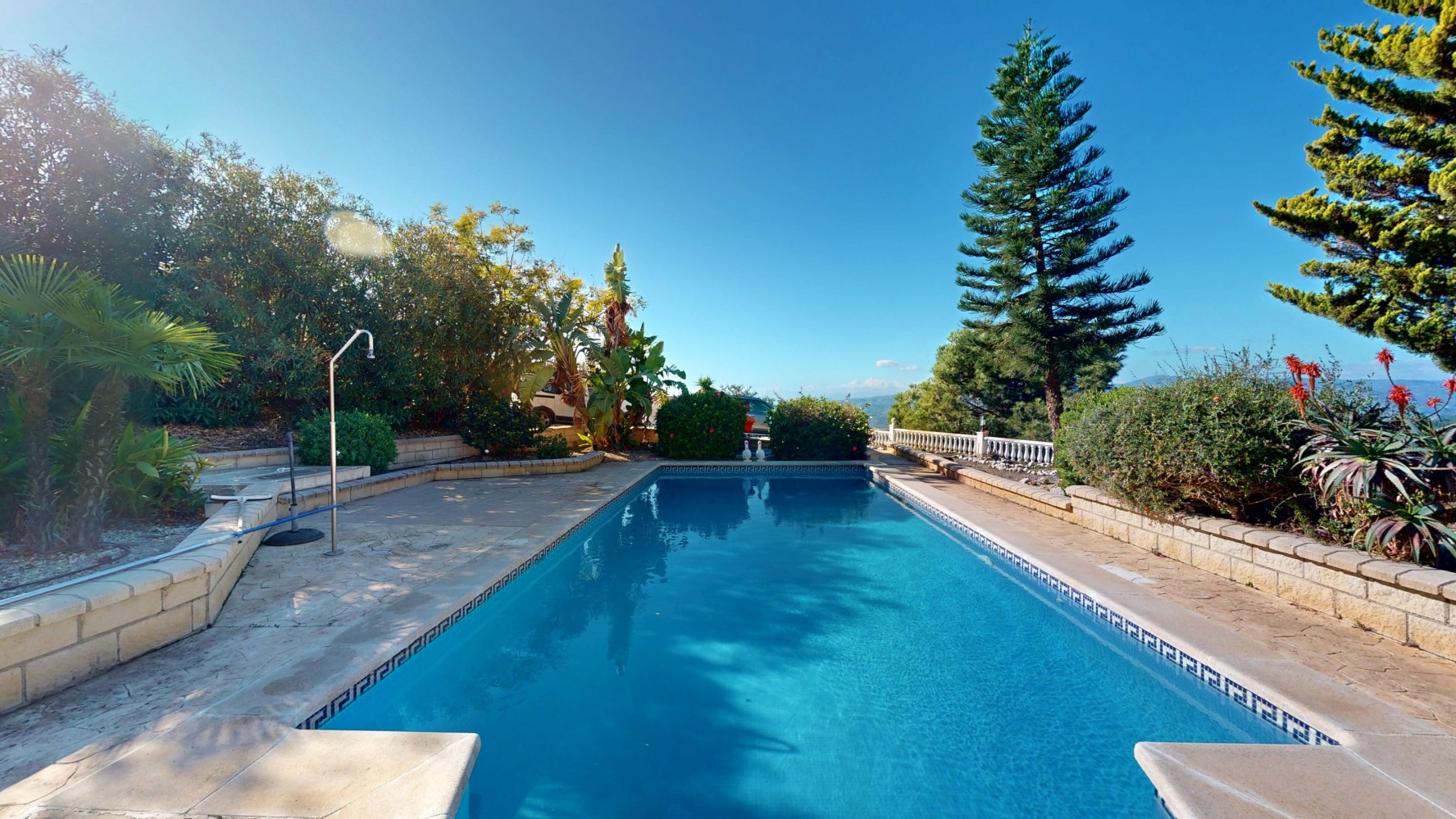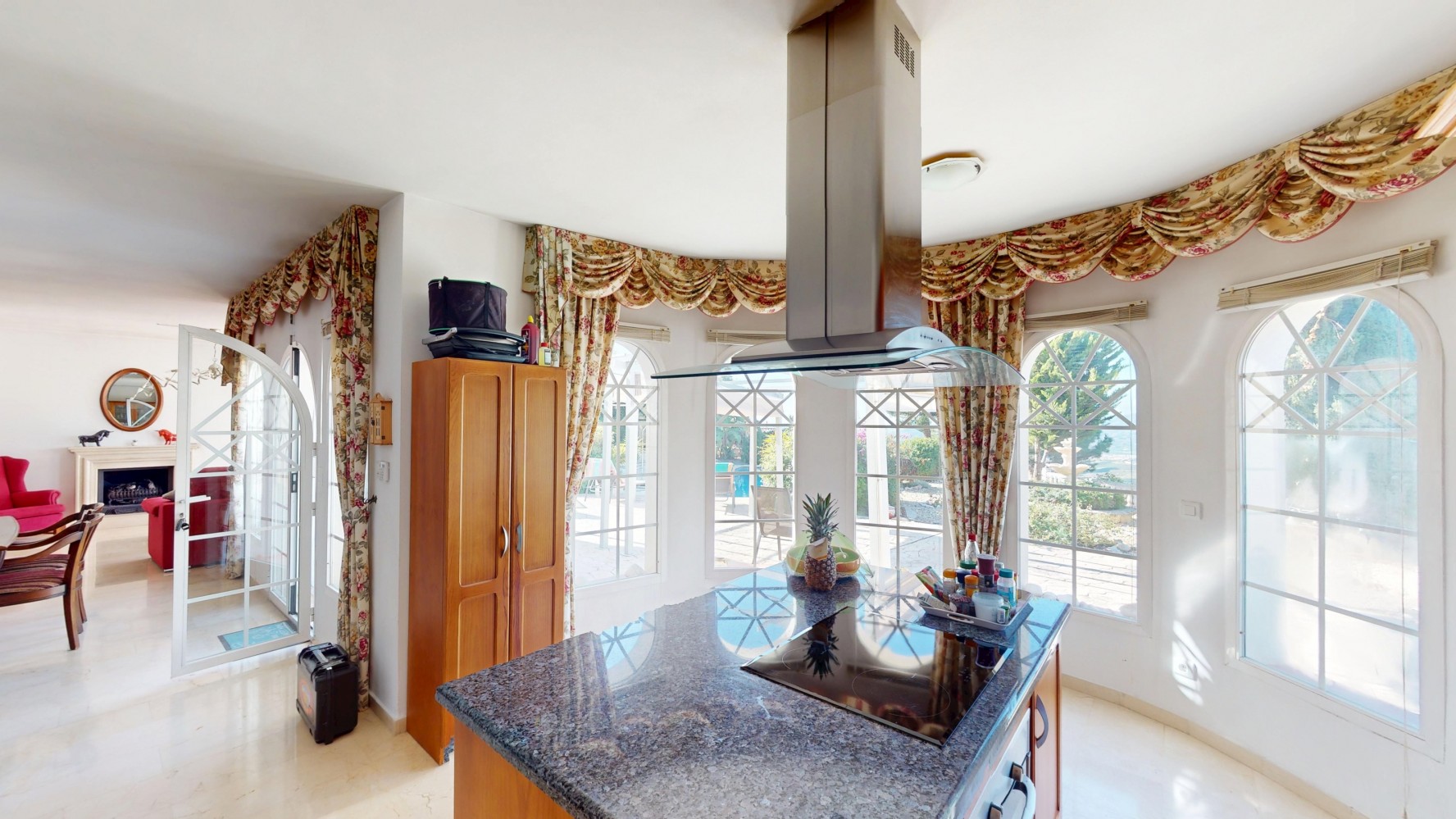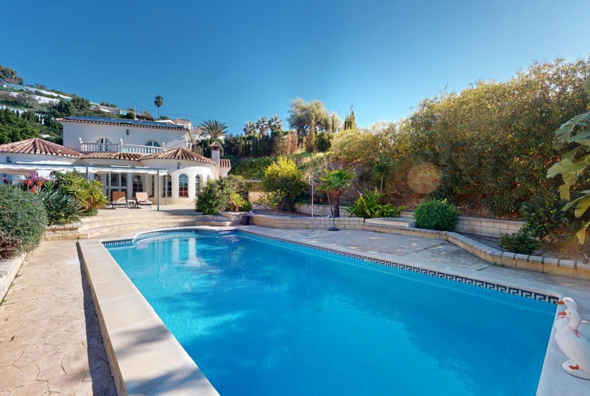 This elegant villa in Arenas, Málaga, offers a harmonious blend of space and style across two levels. The residence boasts four bedrooms and three bathrooms, with the primary bedroom providing generous personal space. The ground floor houses the main living areas, while the upper floor offers additional living space. The villa's interior is characterized by bright, airy rooms with large arched windows that flood the spaces with natural light. The living room features a cozy fireplace, plush red seating, and ornate curtains that add a touch of luxury. The dining area showcases a grand wooden table illuminated by a crystal chandelier, creating an ideal setting for elegant meals. The kitchen, visible from the dining area, offers warm wood cabinetry and modern appliances. Bathrooms are well-appointed with modern fixtures, including glass shower enclosures and ample storage. Bedrooms are tastefully decorated, some featuring bold color schemes with red accents, while others maintain a softer palette. Throughout the villa, the decor embraces a Mediterranean flair with ornate curtain valances, traditional wooden furniture, and warm color tones. Outside, the villa offers a spacious garden with trees, creating a tranquil setting to relax or entertain. The property also features a private pool, perfect for enjoying the sunny weather. For convenience, there is ample parking space and a storage room for additional belongings. A water deposit is included, ensuring a consistent water supply. The villa's exterior hints at outdoor living spaces, perfect for enjoying the Spanish climate. This villa combines comfort, style, and functionality in a desirable Málaga location. We are pleased to be able to present this dream property to you soon, either personally or via virtual viewing. Because this world is unique - just like our Axarquía. In Andalusia. On the Costa del Sol. Here, on the sunny side of life...
