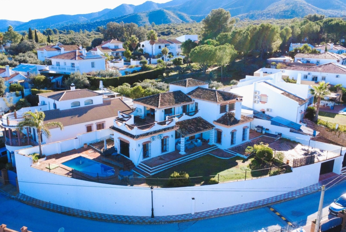 Stunning detached villa with incredible views to the Mijas mountains and Guadalhorce valley, situated between the villages of Alhaurín El Grande and Alhaurín de la Torre, plus only a 5-minute walk to Lauro Golf. The ground floor of the villa is finished in a rustic style and benefits from a generous living room with fireplace, fully fitted kitchen with utility room, 3 double bedrooms (all with fitted wardrobes), 2 bathrooms, and a guest WC. On the top floor is a mezzanine living area, currently used as an office, a huge master bedroom with ensuite bathroom accessed via hidden access between fitted wardrobes, and there is access to the roof terrace. The outside of the villa is terraced and offers magnificent views, as well as an enclosed glass terrace from where you can enjoy the winter sun. The basement has an off-road garage and storeroom with direct access to the house. The listing agent, on behalf of the vendor, provides this information as guidance only and is not contractual. While efforts have been made to ensure accuracy, buyers should verify all details through their own inspections and inquiries. The data may be subject to errors, price changes, availability, or withdrawal without notice.