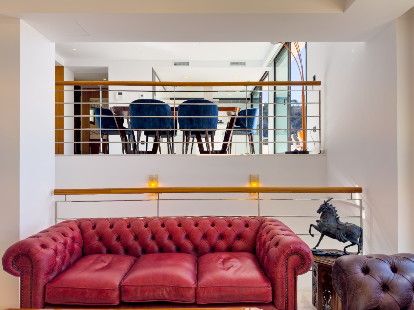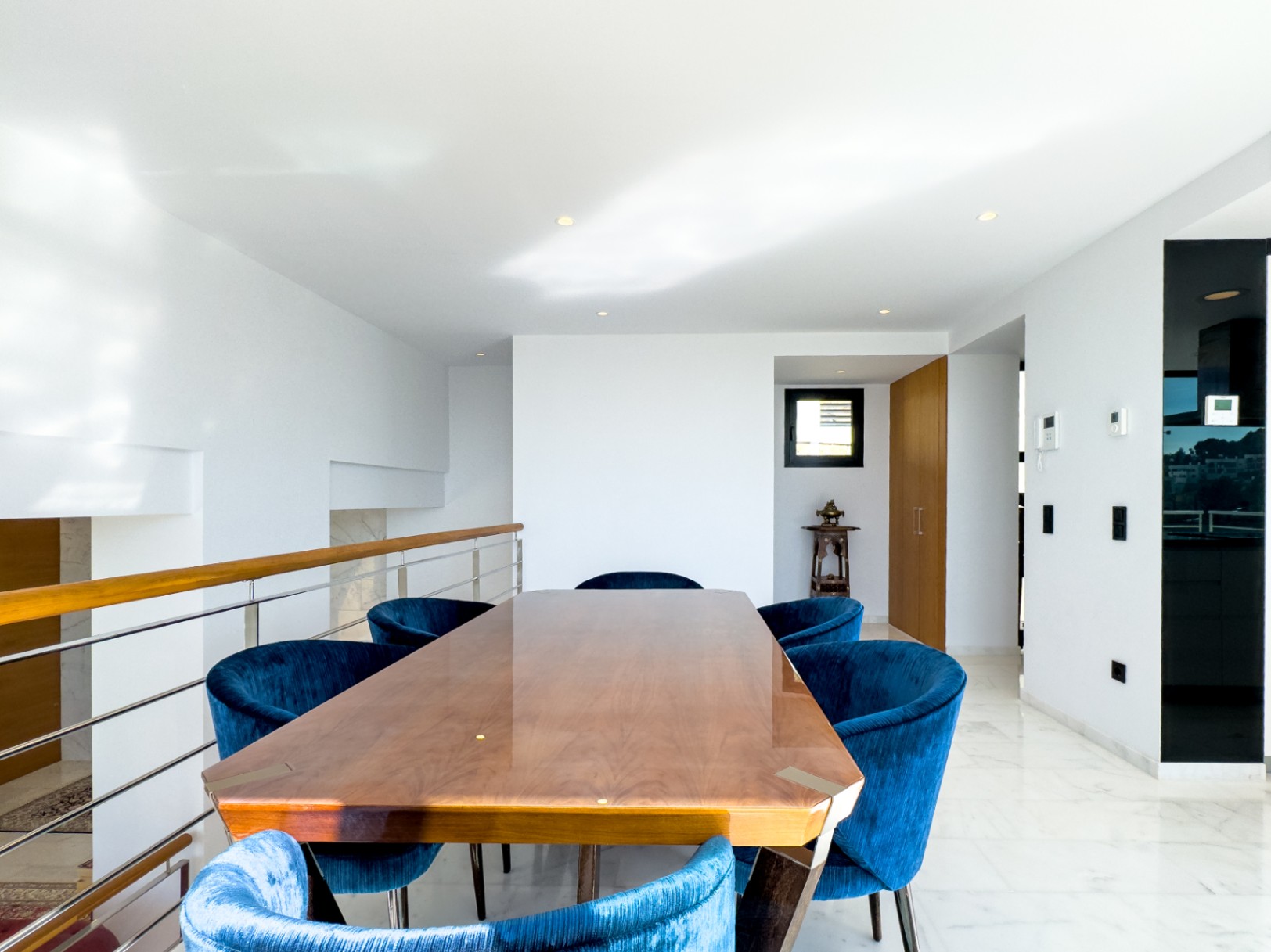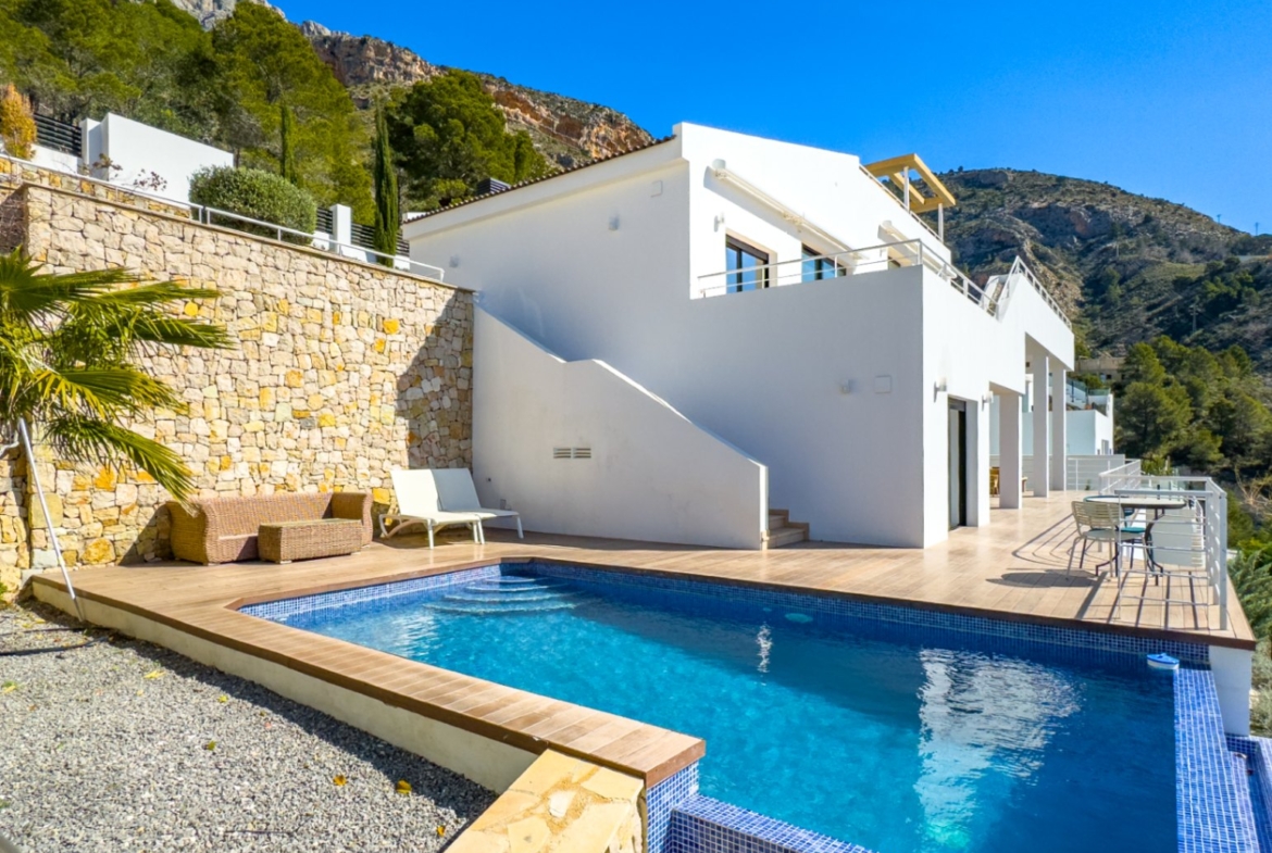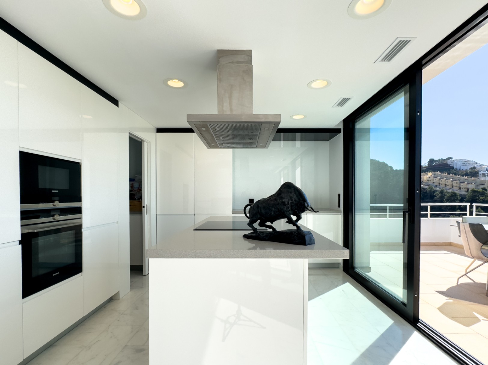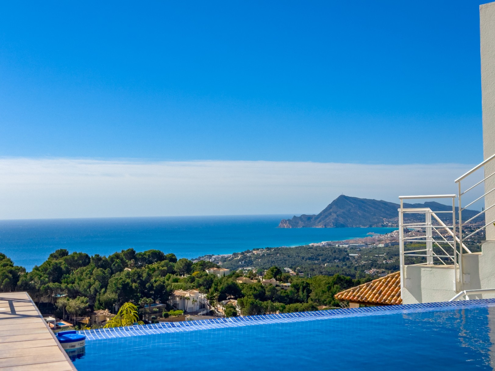 This is a modern resale villa of 450 m² built in 2017, located in Sierra de Altea within a gated community on the Costa Blanca. The property is arranged over two floors plus a roof terrace, on an 800 m² private plot with approximately 200 m² of outdoor terrace space. It has a south-east orientation and panoramic views of Altea's coastline and bay. There is one outdoor parking space and a storage room. The interior is open plan on the main level, with a fully equipped kitchen featuring a central island, Siemens built-in appliances, and high-gloss white cabinetry. Flooring throughout is marble. The property has three bedrooms with the option to configure a fourth, and three bathrooms. Climate control is provided by underfloor heating (heat pump) combined with ducted air conditioning, making it suitable for year-round use. Windows are double-glazed PVC. The villa is in original condition and very well maintained; the exterior has recently been repainted. Outdoor spaces include a private infinity pool with an adjacent wooden deck terrace, a main terrace with direct access from the living area, and a roof terrace with a concrete pergola structure and a built-in outdoor kitchen. The Altea golf course is nearby, and the centre of Altea la Vella is approximately 2.5 km away. The nearest beach is around 4 km.