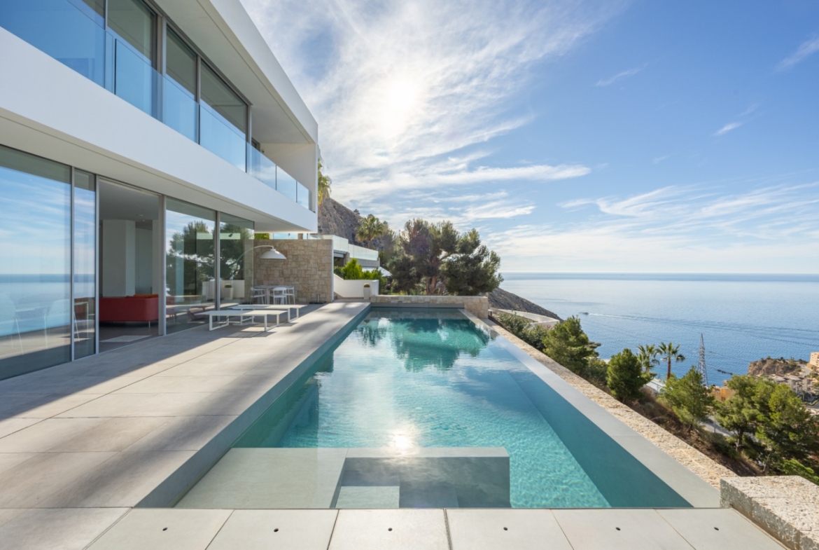 Luxury modern villa for sale, built to the highest construction standards, offering stunning sea views in the Mascarat area. This exquisite property provides unparalleled privacy and tranquility. With a spacious layout spanning 300m2, including a versatile basement beneath the 12x3.5M heated pool, this villa boasts a modern white elevator connecting all levels for effortless navigation.