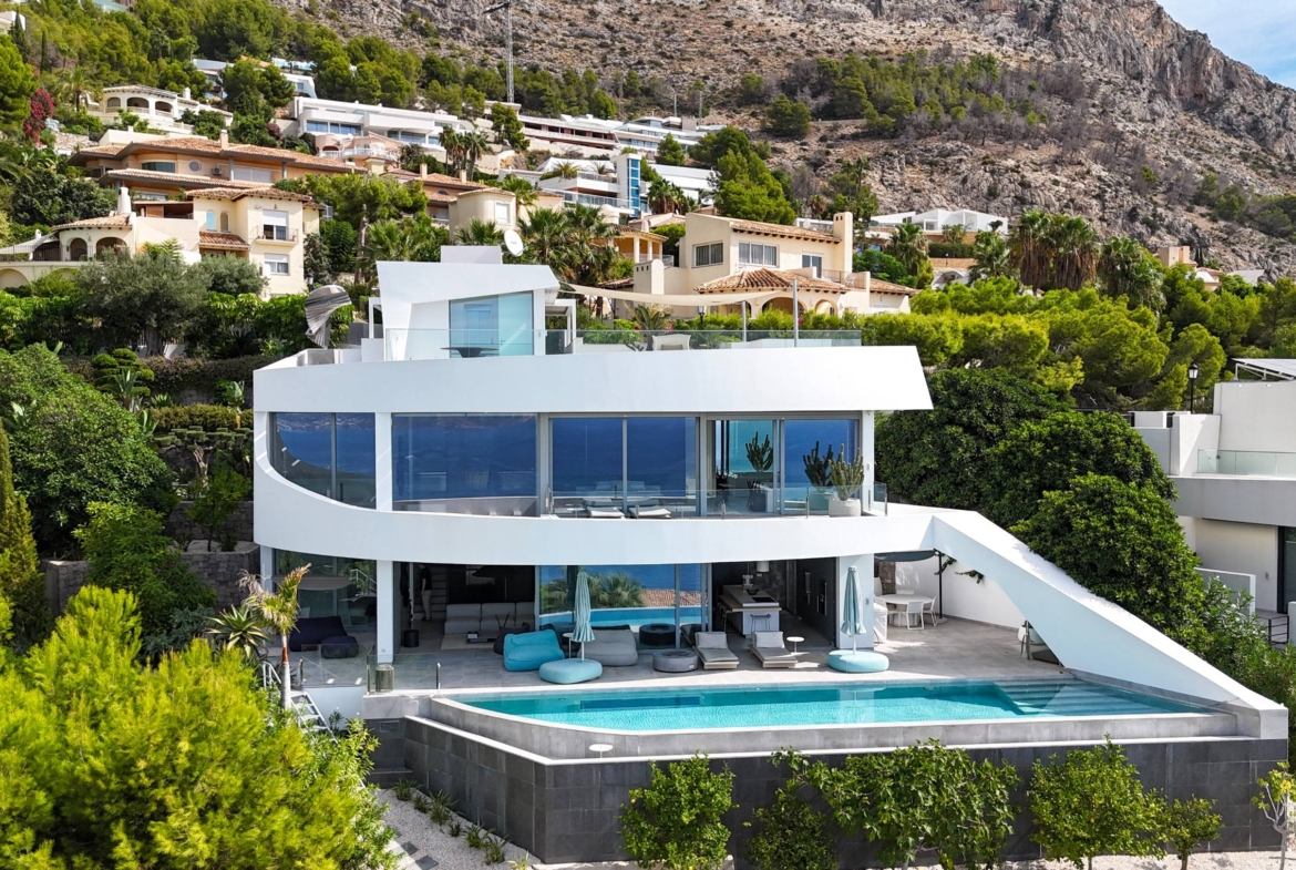 Designed by the acclaimed KUOO architects and completed in 2018, Villa Francia is a striking example of contemporary Mediterranean living at its finest. Set within the prestigious enclave of Altea Hills, this south-facing residence captures uninterrupted views of the coastline, offering a seamless blend of architectural mastery, refined design, and timeless elegance.~~Inside, the villa exudes an atmosphere of calm sophistication. Impeccably furnished, the interiors strike the perfect balance between modern luxury and inviting warmth. The master suite is a private sanctuary, complete with its own terrace, hot tub, and spectacular sea views. Three further bedrooms, each with distinctive character, provide comfort and style for family and guests alike.~The heart of the villa lies in its open-plan living and kitchen area, where floor-to-ceiling windows flood the space with natural light, and interiors flow effortlessly to expansive terraces. Here, a shimmering infinity pool seems to merge with the horizon, creating the ultimate backdrop for Mediterranean living.~~On the lower level, a generous leisure area awaits — featuring a sauna, gym potential, and a dramatic pool window that bathes the space in a tranquil glow. A private lift ensures convenience across every floor, while bespoke details such as high-end appliances and a state-of-the-art Bang & Olufsen entertainment system elevate the experience of daily living.~~The Setting – Altea Hills~Altea Hills stands as one of the most coveted addresses on the Costa Blanca. Known for its elevated position and 24-hour security, this exclusive community offers both privacy and prestige. Lush landscaped surroundings, panoramic sea views, and proximity to Altea’s old town, luxury marinas, golf, and fine dining combine to create a lifestyle of unparalleled elegance.~~ ~~~~