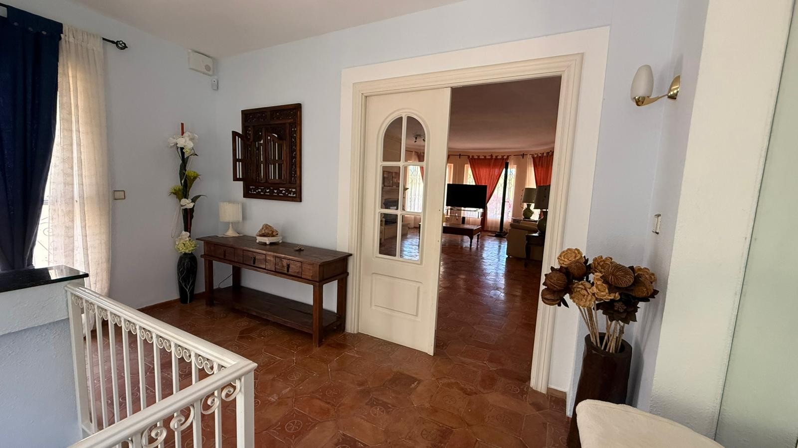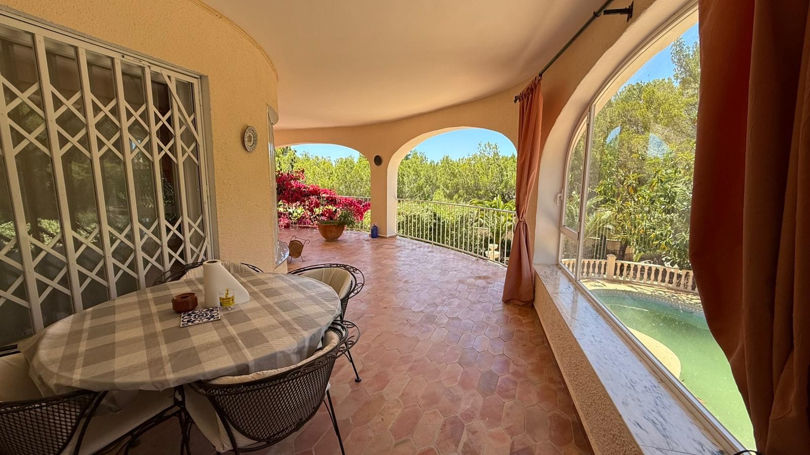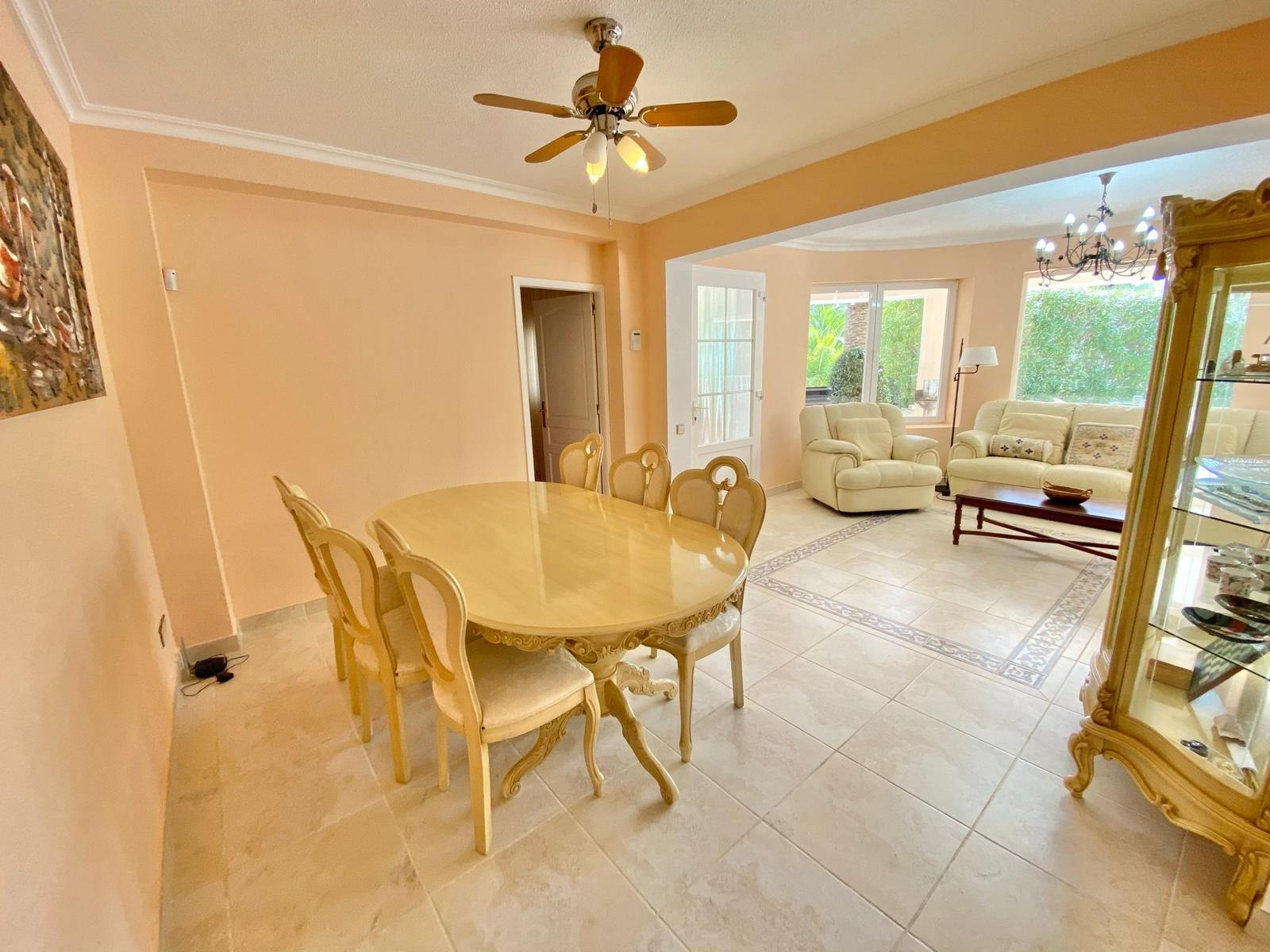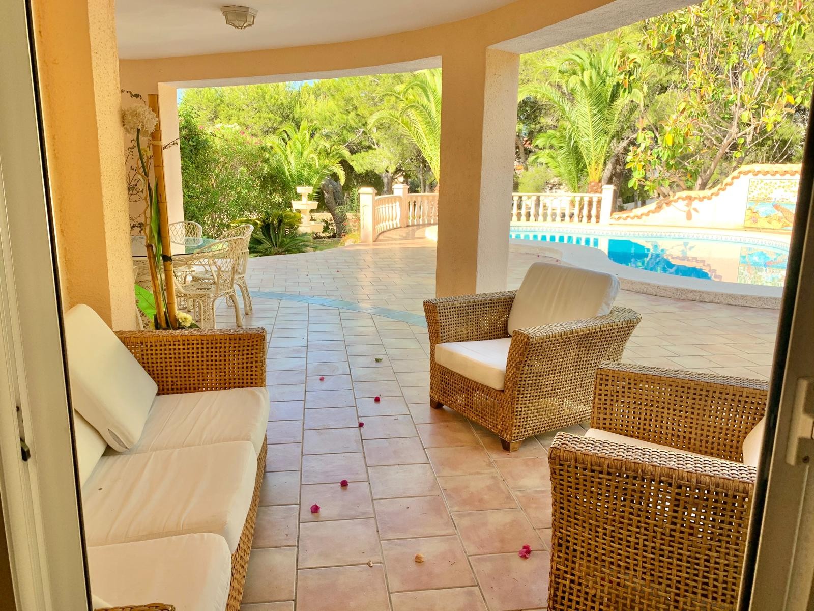 Set on a generous and fully enclosed plot of 1,990 m², the villa offers 427 m² of living space distributed over two floors. The plot stands out for its expansive lawn areas and mature Mediterranean landscaping, including palm trees, fruit trees, pines and cypresses, creating a peaceful and private atmosphere.Tour of the house