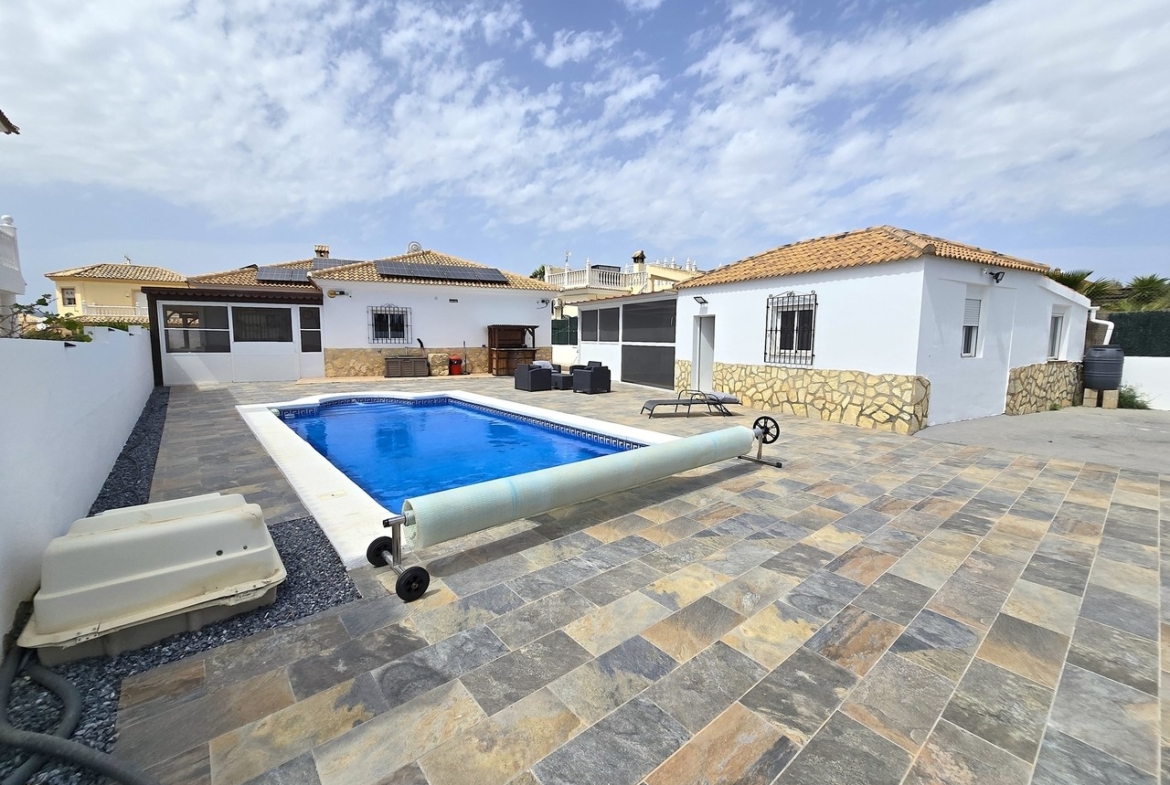 Access to the property is via either a pedestrian gate or a vehicle entrance, both leading into a welcoming courtyard framed by attractive citrus trees. From here, you are greeted by a generous private swimming pool, the villa itself, and a detached garage/store room.