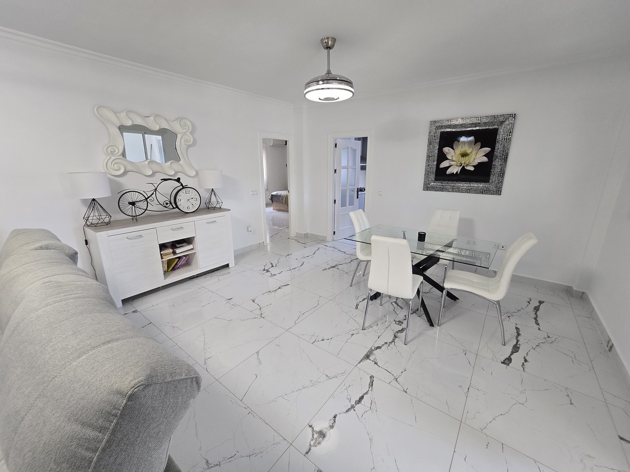 The main entrance opens into a spacious and bright fully fitted kitchen, complete with modern appliances and elegant granite worktops. This flows seamlessly into an open-plan dining and living area, featuring ceiling fans, a pellet burner, and ample space for comfortable furnishings.