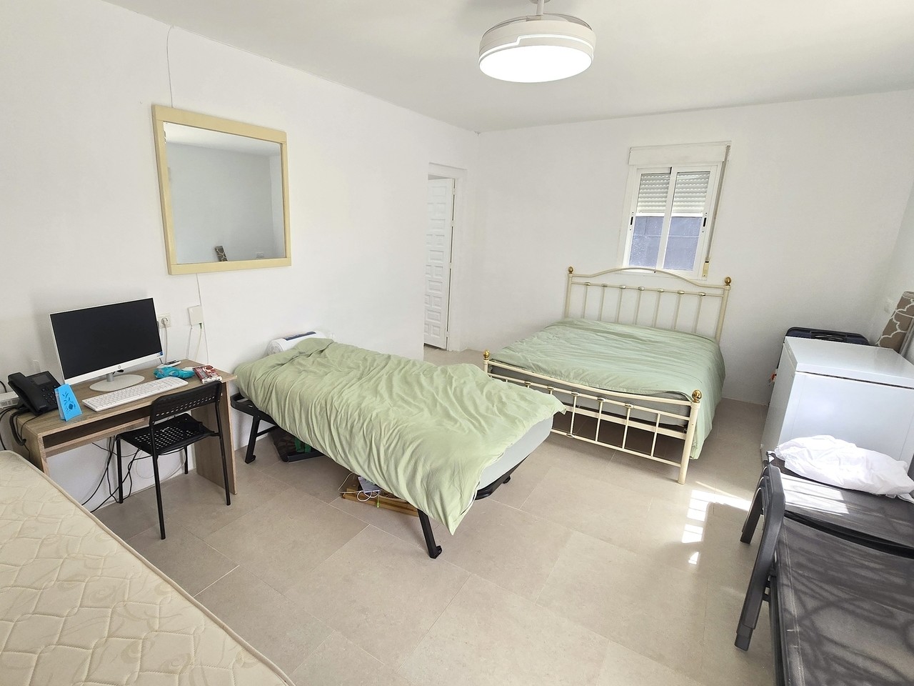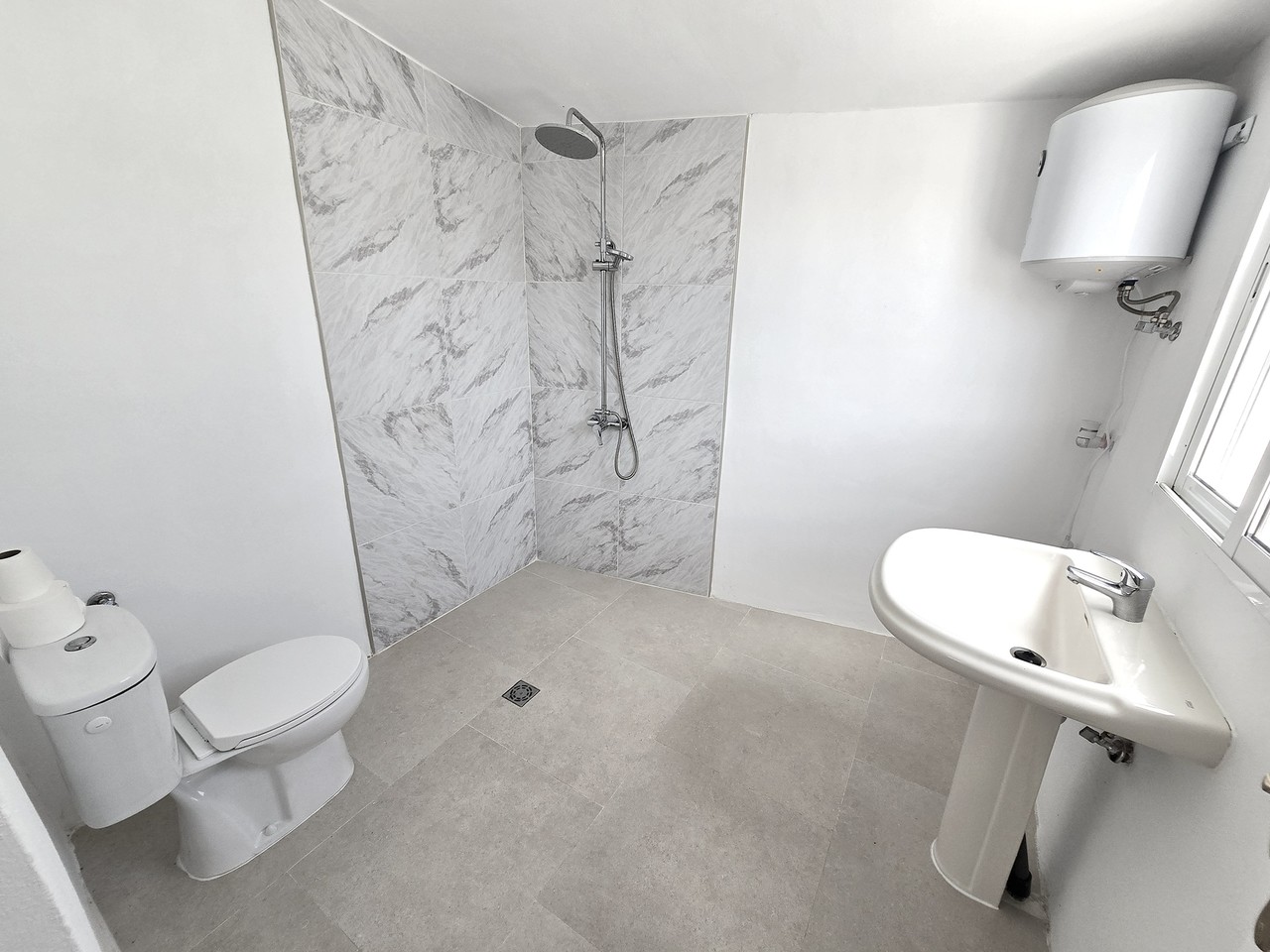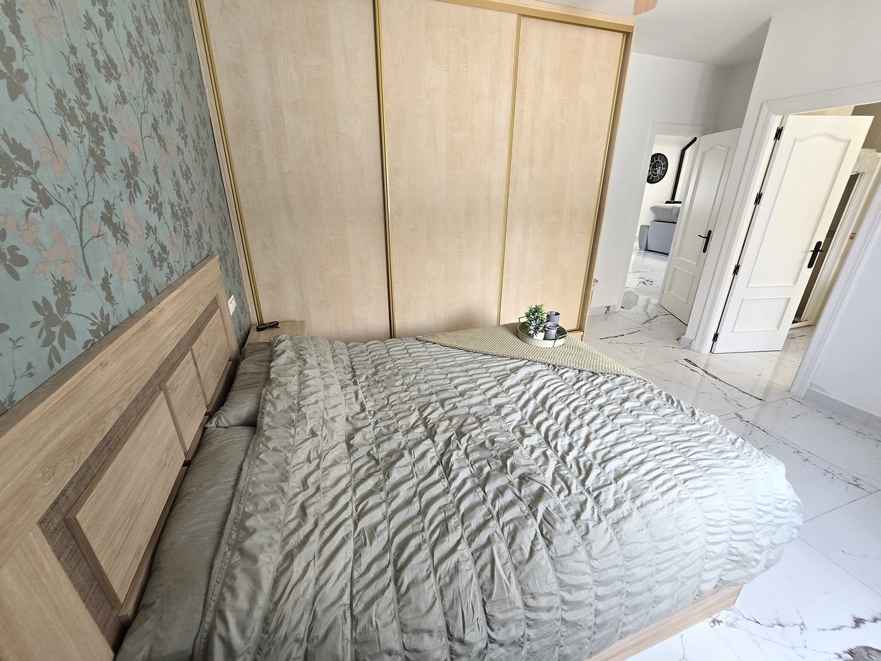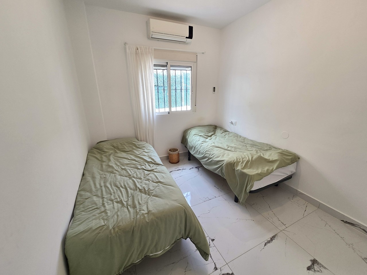 A short hallway leads to two well-proportioned guest bedrooms, both with built-in wardrobes, as well as a family bathroom equipped with a walk-in shower, basin, and WC.