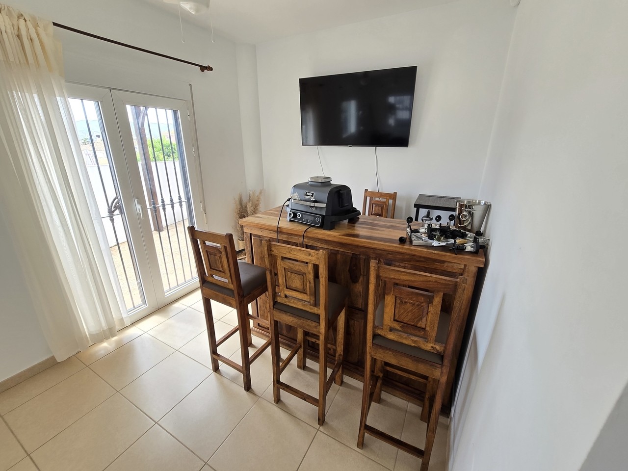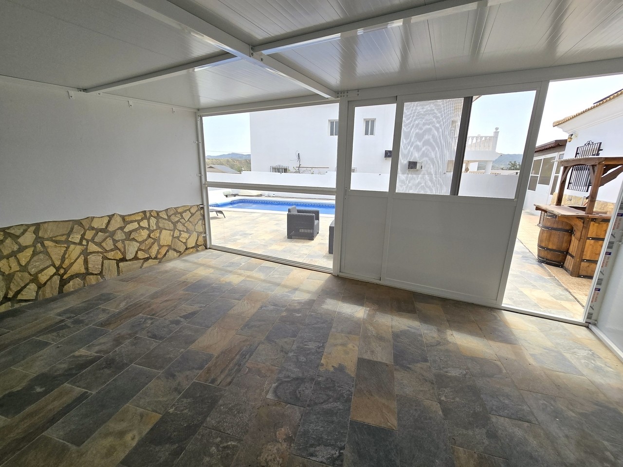 Additionally, patio doors from the lounge open into a separate living room, currently arranged with a bar area and extra seating. Further patio doors provide direct access to the outdoor terrace.