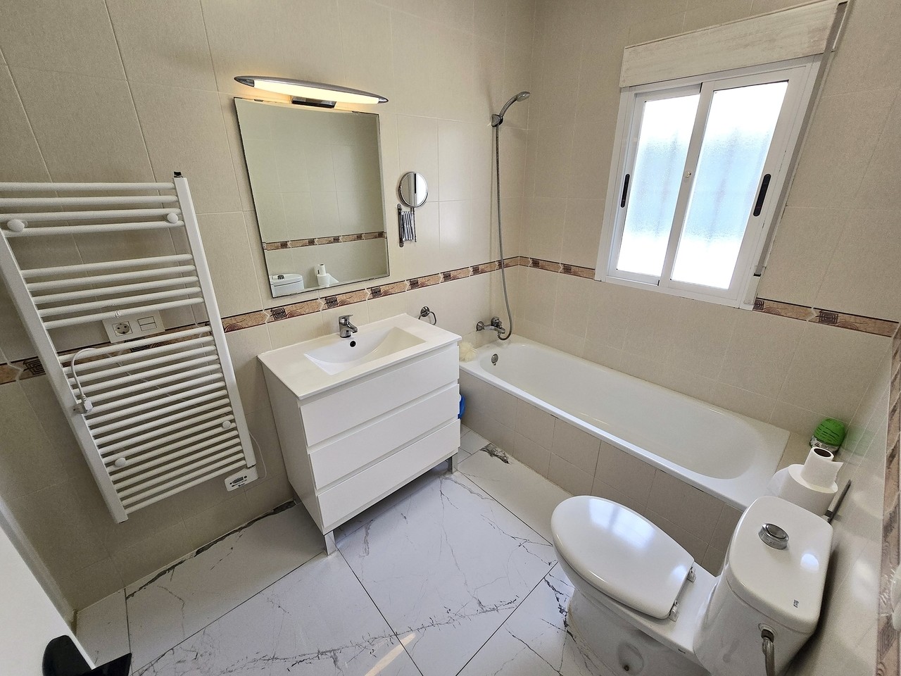On the opposite side of the lounge, you will find the main double bedroom, which is bright and spacious, also benefiting from built-in wardrobes and a private en-suite bathroom. This is fully tiled and includes a bathtub, walk-in shower, basin, and WC.