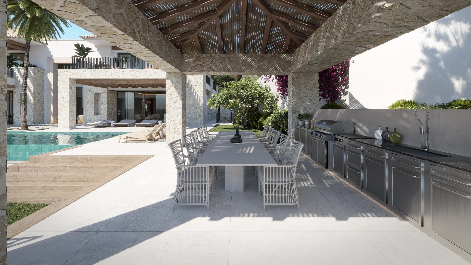 The exterior of the villa is designed to fully enjoy the Mediterranean climate. It features a private pool, ideal for relaxing and enjoying the sun. Additionally, there is a pergola providing a shaded space perfect for outdoor dining or relaxation. The property also includes a jacuzzi, offering an additional touch of luxury and comfort.