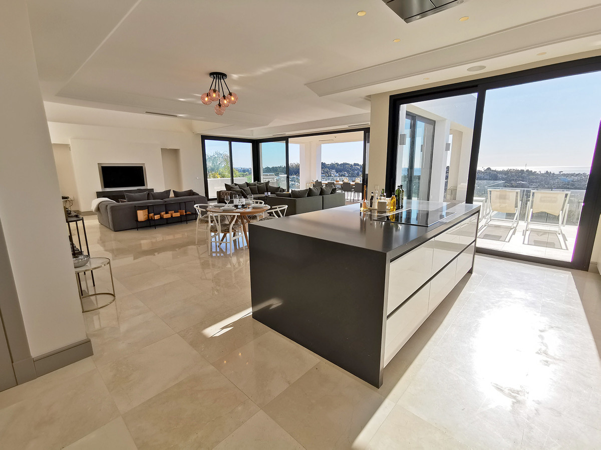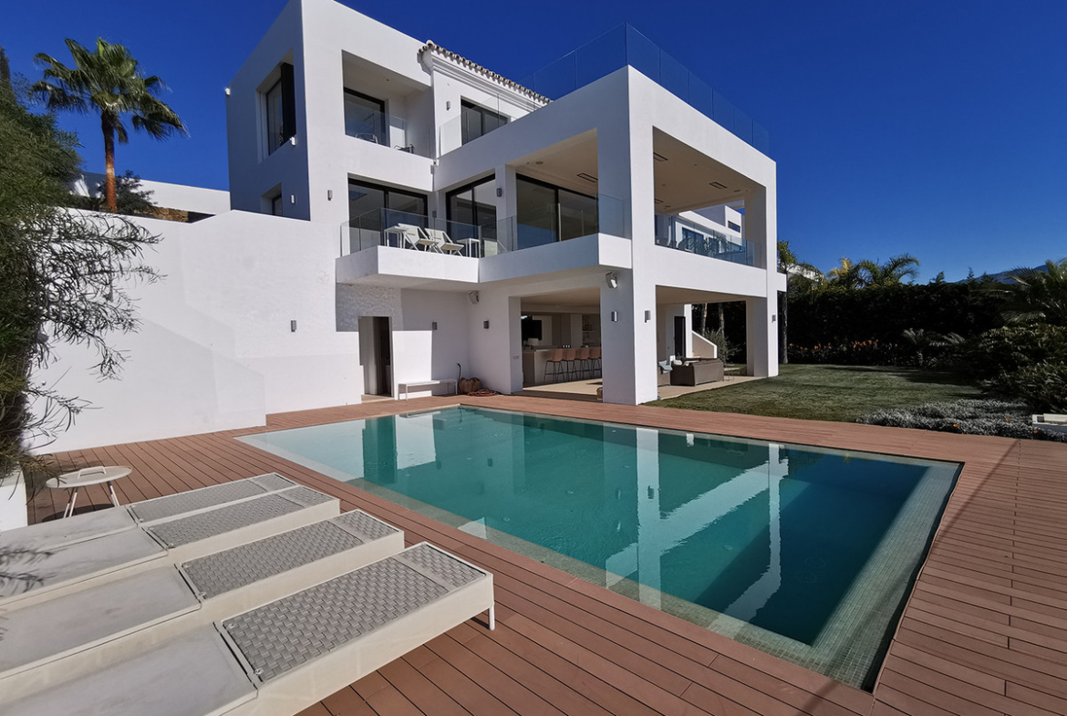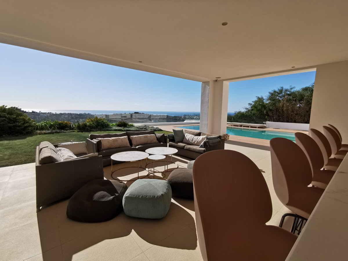 Villa for sale in , Benahavis with 5 bedrooms, 5 bathrooms, 2 toilets and with orientation south, with private swimming pool. Regarding property dimensions, it has 547 m² built, 2,000 m² plot and 189 m² terrace. Has the following facilities amenities near, fully fitted kitchen, utility room, fireplace, guest room, storage room, alarm, double glazing, video entrance, dining room, guest toilet, private terrace, living room, water tank, sea view, mountain view, golf view, heated pool, automatic irrigation system, bars, laundry room, internet - wifi, covered terrace, panoramic view, steam room, close to sea / beach, close to golf, uncovered terrace, glass doors, open plan kitchen, optional furniture, excellent condition, saltwater swimming pool, close to shops, close to town, close to schools, surveillance cameras and inside golf resort.
