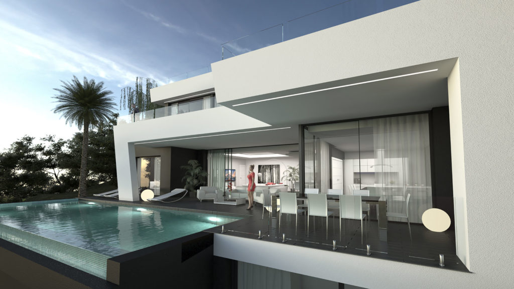 The interiors of the villas are designed to be spacious, functional and full of natural light. With 486 m² built and 319 m² of living space, each villa has four double bedrooms, five full bathrooms and a basement that adds flexibility to the layout. The rooms are characterised by their simplicity and elegance, with a focus on comfort and well-being. The kitchens, integrated into the open-plan design of the home, offer a modern and functional space, while the terraces connect seamlessly with the interiors, creating a continuous flow between indoors and outdoors.