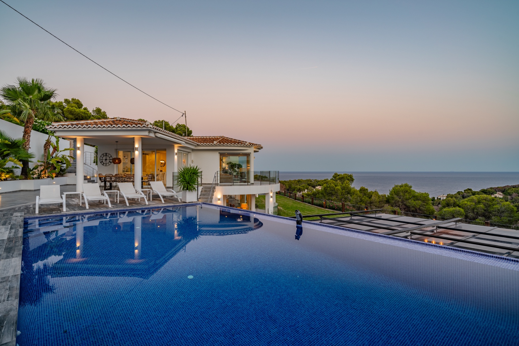 This exceptional estate boasts one of the most exclusive and far-reaching sea views on the Costa Blanca, enjoyed from a spectacular main terrace with an infinity pool, Jacuzzi, and a fully equipped outdoor kitchen with bar. Inside, a grand entrance flows into an open-plan living and kitchen area framed by panoramic floor-to-ceiling windows, ensuring the view remains a constant masterpiece.
