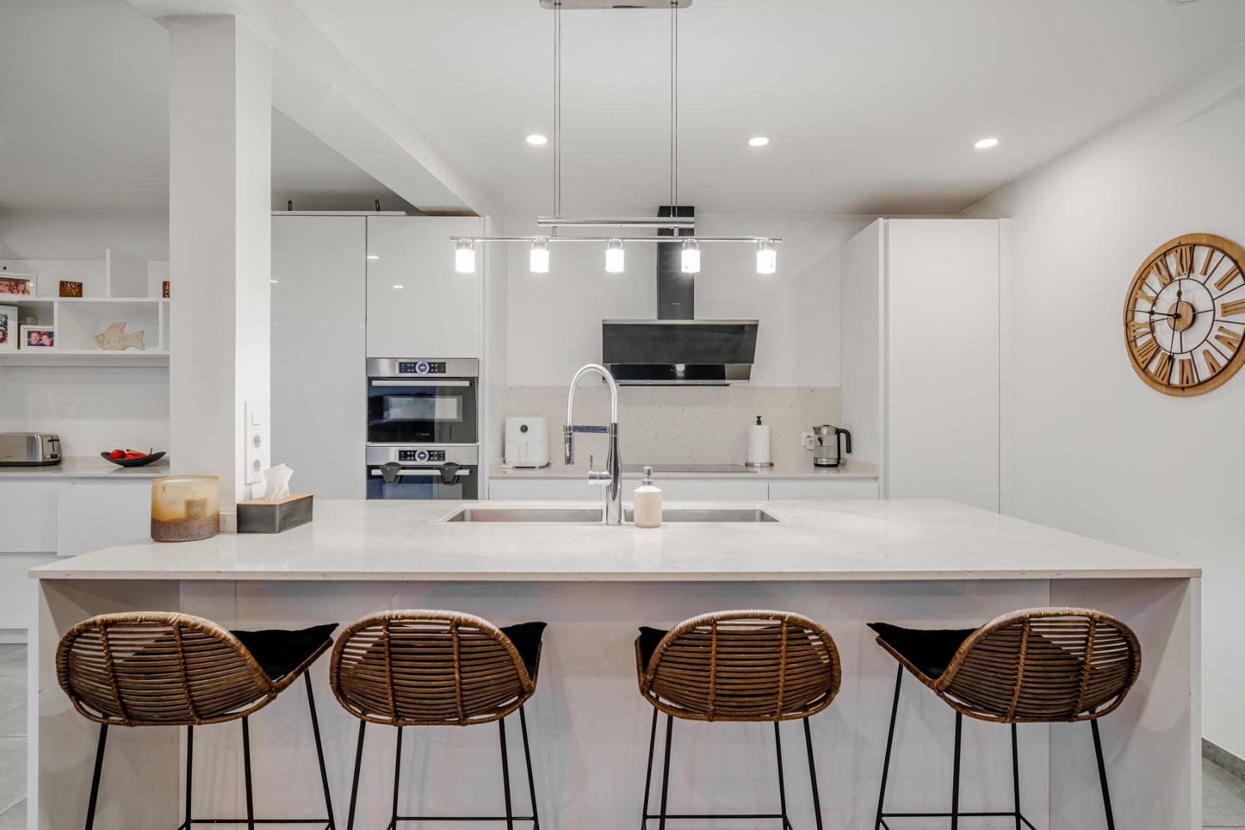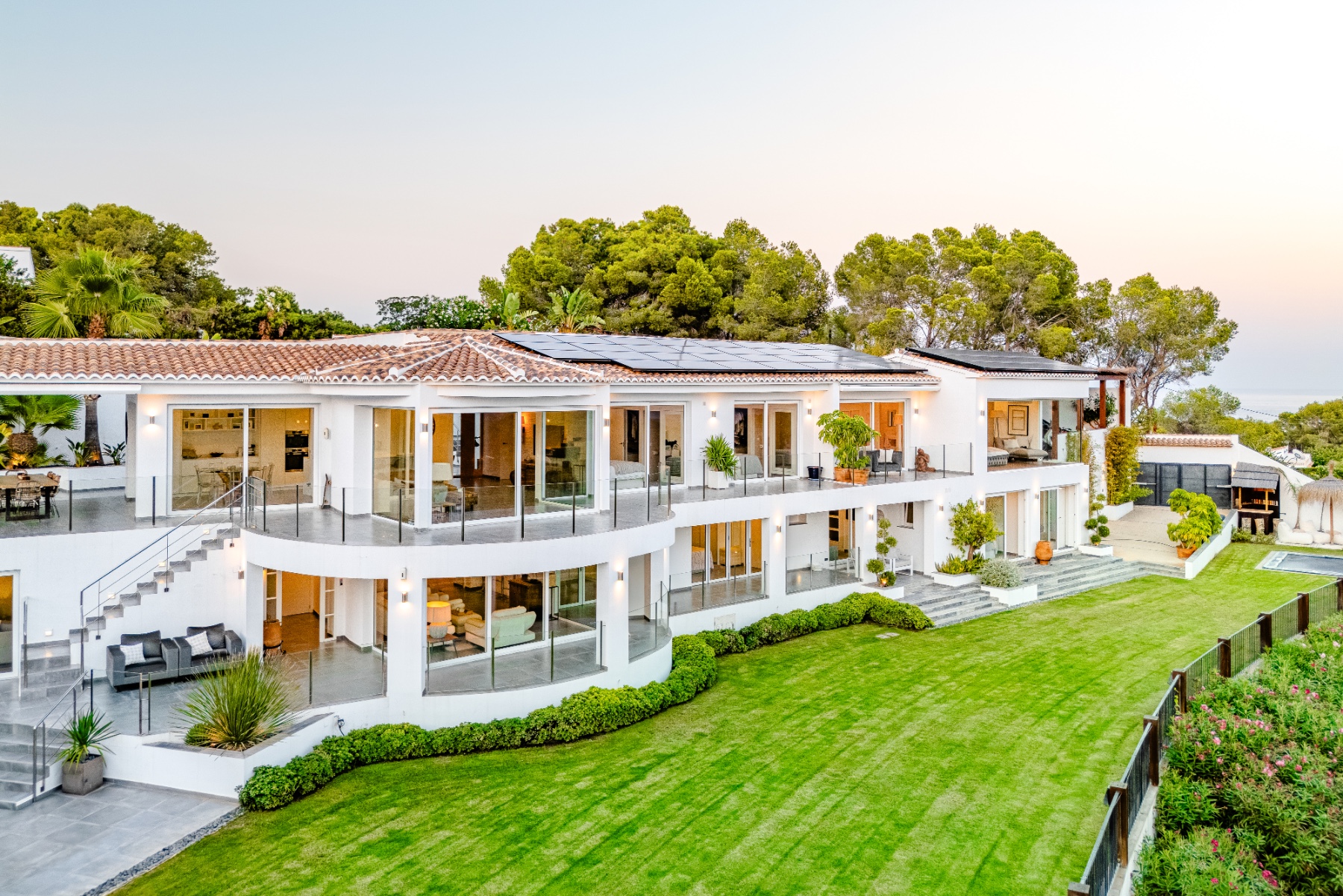The property’s south-southwest orientation ensures sunlight throughout the day, fully harnessed by 45 rooftop solar panels that contribute to exceptional energy efficiency. A stylish bar area with a trampoline is perfectly positioned to catch the last sunbeams at sunset.