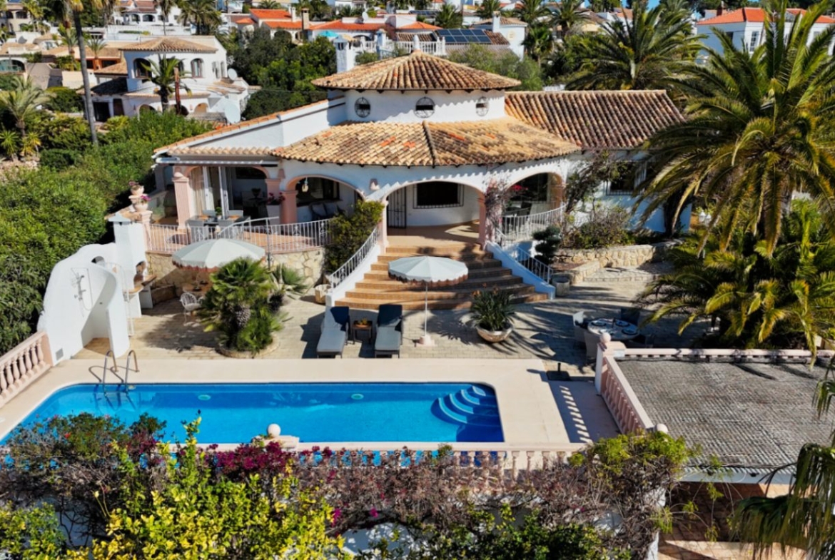Detached villa with sea views, swimming pool and 3 bedrooms for sale in San Jaime, Benissa (Costa Blanca). Fenced plot, close to golf and amenities. This villa for sale in Benissa is located on an almost flat and fully fenced plot in the residential area of San Jaime. The property faces southwest and offers sea views and views of the Peñon de Ifach from the pool terrace. Apart from a few steps at the entrance, the property is on one level. A few steps lead to the spacious veranda with beautiful sea views. From here you enter the living room with double-height ceiling and fireplace. This flows seamlessly into the dining room, which is next to the open-plan, fully fitted kitchen. On the other side of the living room is a conservatory and an additional terrace. The villa has three bedrooms: a spacious master with en-suite bathroom and two bedrooms with shared bathroom, all with fitted wardrobes. Outside you will find a mature Mediterranean garden with several seating areas, an 11 × 4 m pool, barbecue and outdoor shower. Part of the porch is glazed for use in all seasons. Special features Sea view villa Benissa on the southwestSwimming pool (11 × 4 m) and Mediterranean gardenMostly single-storey livingGarage, carport and large storage/laundry roomCentral heating and air conditioning in the master bedroomFenced plot and irrigation systemClose to supermarket, restaurants and golfWhy view this villa Single-storey livingExcellent sun exposureBeautiful sea views and views of the Calpe rockCentral location on the Costa BlancaSan Jaime has a good reputationLots of outdoor spaceA complete villa with sea views waiting for a new owner. An owner who, with enthusiasm, energy and love, will transform the property into a contemporary, comfortable villa in an excellent location with fantastic views. Are you that new owner? Make an appointment and see for yourself the possibilities this villa has to offer.