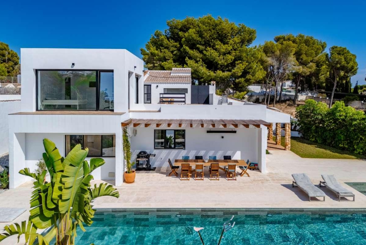 Not all villas surprise you. This one does. Located on a spacious flat plot in La Fustera, Benissa, it combines Mediterranean character with modern design, offering panoramic views of the sea and mountains. Its location is as convenient as it is beautiful: just a few steps from La Fustera beach and the coastal path, and only minutes from the marinas, restaurants, and hidden corners of Moraira and Calpe. From the moment you arrive at its quiet cul-de-sac, the villa immerses you in a unique atmosphere. A majestic entrance, a wide driveway, and an independent double garage welcome you inside, where light floods a 100 m² open space with a designer kitchen featuring a central island and a magnificent glazed patio. Access to the main floor is smooth and step-free, making life here as simple as it is elegant. Stepping outside, you'll enter a private universe designed for unforgettable moments: a heated 14-meter swimming pool with a jacuzzi, stone terraces, relaxation lounges, and covered dining areas. Whether with friends, family, or simply with a glass of wine, this villa is made for maximum enjoyment. On the upper floor, the atmosphere is one of absolute relaxation. A VIP suite with stunning views of the Peñón de Ifach, two additional bedrooms with en-suite bathrooms, a Sky office, and a panoramic solarium complete the ensemble. With amenities like a 10 kW solar system, an intelligent security system, ducted air conditioning, and timeless exterior design, this villa offers not just style, but also peace of mind. This is not just any villa for sale on the Costa Blanca. It's a place where architecture, comfort, and the Mediterranean lifestyle perfectly merge: an elegant home in La Fustera that reflects you.
