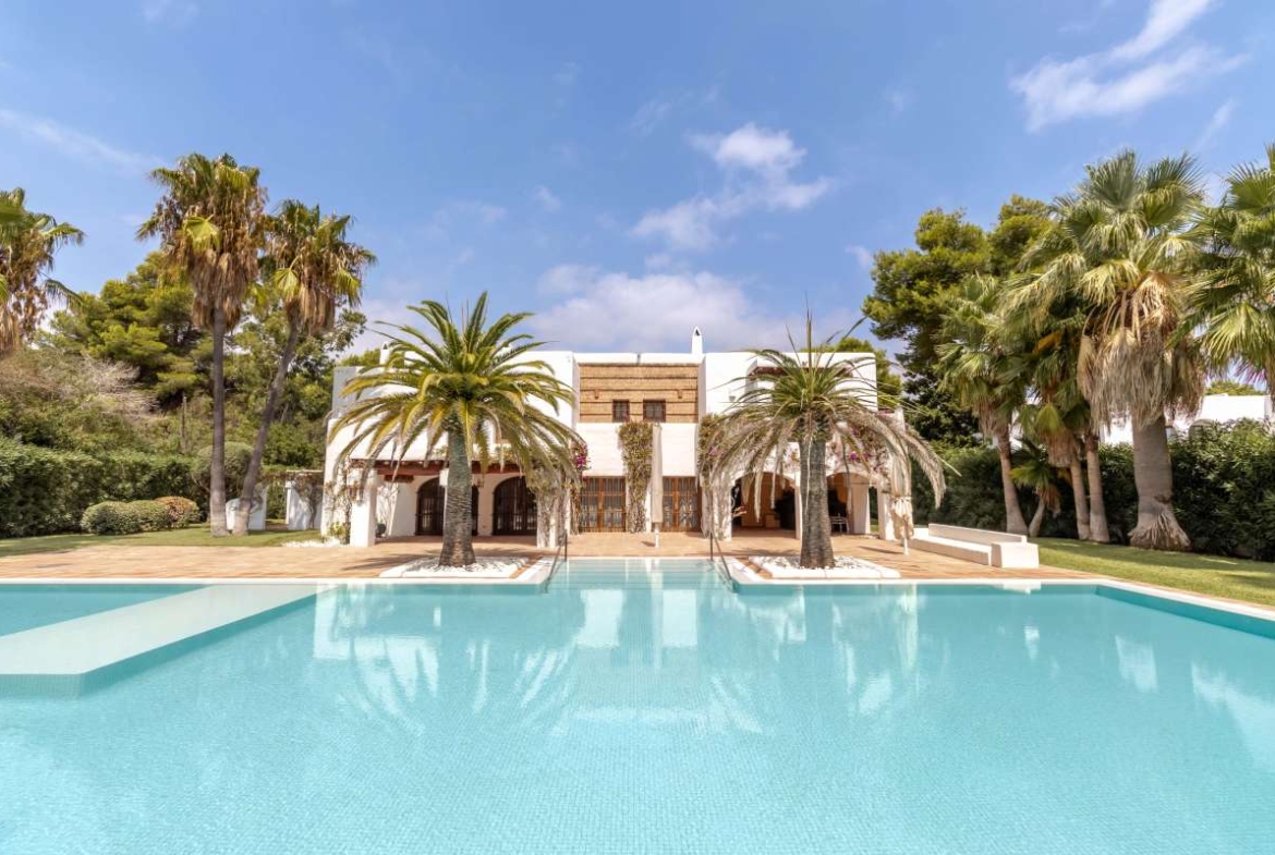 The surroundingsThis impressive majestic villa is located in one of the most beautiful and tranquil east-coastal areas of Ibiza, offering panoramic sea views through the garden and from the terraces. Enjoy absolute privacy in this extraordinary plot. You will be a stone's throw away from the picturesque beaches Es Canar, Playa Niu Blau and many more. Also, the popular cristalline beach Cala Nova is only a 10 min drive away. Here you will find well-known classy beach restaurants such as Atzaro beach, Aiyanna and the culinary high-end restaurant Etxeko in the Bless hotel. For more entertainment, the famous Ibizan hippie markets Las Dalias and Punta Arabi are also just a few minutes away by car. The vibrant Eivissa old town is just 30 minutes away and the airport is reachable in 35 minutes. This beautiful finca is a true gem located in the middle of Ibiza’s chic east-coast, offering you a true paradisiacal lifestyle.The villaThis gigantic property has a 540m2 built living space spanned over a generous 5.631m2 plot. Upon entering the hall, you will find traditional stairs and the warm wooden beams on the ceiling that give the house character. The open plan living room has a traditional fireplace, and is perfectly connected to the garden with its many floor to ceiling windows. There is a large corner kitchen with a separate door to the garden as well. To make the house more comfortable, certain practical features are added such as a walk-in fridge in the grand kitchen, and a modern elevator in the hallway. Moving upstairs, the master bedroom has a beautiful balcony overlooking the tropical garden and magnificent pool, with the ocean in the background. It also comes with a large ensuite bathroom. The other bedrooms also have their own balconies with the spectacular garden views, making it a dream to wake up in your own private paradise. The house also comes with air conditioning and heating to keep room temperatures comfortable in any season. Noteworthy, the main characteristics of this magnificent property will be maintained, but renovated with a beautifully new interior design project from Blakstad.The outdoor spacesThe centerpiece of this lush and tropical garden is the remarkable 246m2 large swimming pool. Take a refreshing dip in one of Ibiza’s most beautiful pools, and enjoy a private retreat in your own serene oasis. This garden is also ideal for entertaining and hosting guests with its many convivial and shaded terrace areas, decorated with its pink flowers. Be captivated by the magnificent sea views looking through the surrounding palm trees and the lush greenery, also providing extra privacy. On top of that, there is also a small pathway at the back of the garden, bringing you closer to the ocean in just a few steps. In addition, the front garden offers a large piece of land for agriculture. Entering the property, you will find an automatic gate with a luxurious two-lane driveway, where you can comfortably drive in and park your car in the shaded parking space at the end of the roundabout. There is ample space for more cars to park, making it very convenient and secure when receiving guests or family. Embrace the Ibizencan lifestyle and enjoy the perfect blend of a traditional modern design with exquisite amenities in this majestic villa.