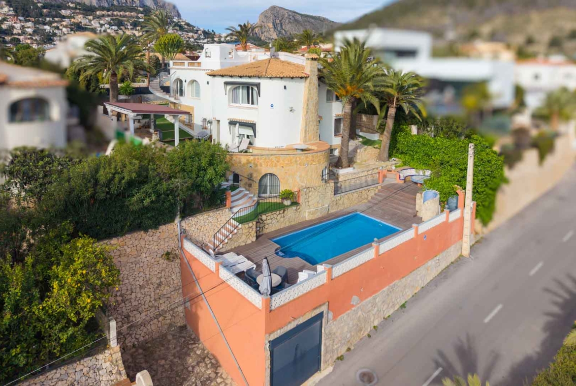 This villa is located in a quiet area at walking distance from the centre of Calpe and offers beautiful views over the Calpe rock and the azure Mediterranean sea. The villa has recently been completely renovated and consists of three floors that are completely independent from each other. Each floor has a private entrance to the estate and a private entrance to the house. This combined with the fantastic location gives this villa huge rental potential with the possibility of living on one of the floors yourself. The first floor consists of a spacious living room, a dining room, a large fully equipped kitchen, two bedrooms and a bathroom. On the second floor we find another spacious living-dining room, a semi-open kitchen, two double bedrooms, a bathroom and a naya. The ground floor consists of an open-plan kitchen with a dining room, two double bedrooms and a bathroom. There are beautiful sea views from all floors. The villa has heating on all floors and air conditioning on the first and second floors. There is also a barbecue area and a dining area under a pergola, a swimming pool with an outdoor shower, a roof terrace, a large garage and outdoor storage space. Moreover, the villa already has a rental licence. Both the centre of Calpe and the beach are just a km away. A fantastic villa in a prime location!
