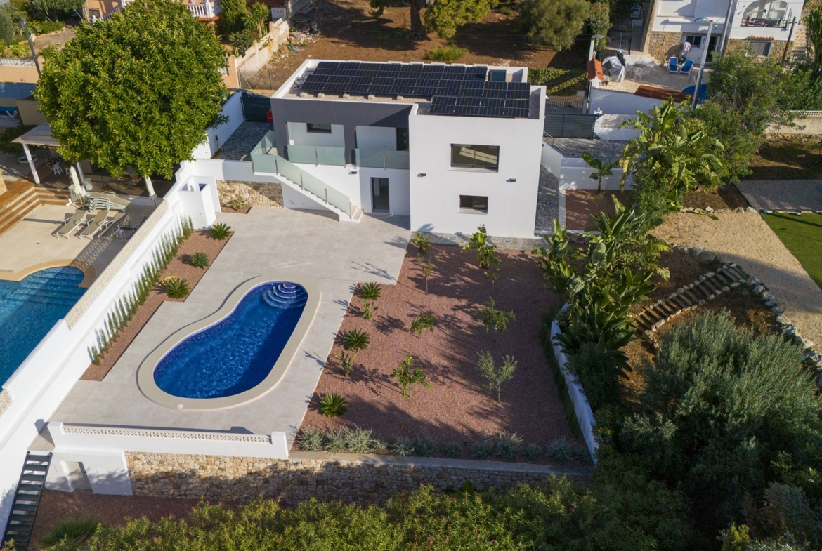 The house comprises two independent dwellings, one on each floor. The upper floor has underfloor heating. Both floors have air conditioning with a heat pump. The kitchens are fully equipped with Bosch appliances: refrigerator, induction hob, dishwasher, extractor hood, oven, and washing machine. The kitchens feature Silestone countertops. Lighting is LED. The bathrooms have glass shower screens and vanity units. A 10 kW photovoltaic solar installation, plus 19.2 kWh of battery storage (8 LV lithium batteries), allows for autonomous operation. There is an outdoor shower with hot water. The exterior joinery is Technal aluminum with Climalit double glazing and security features. Bedrooms have mosquito nets. The blinds are electrically operated. The entrance door is a security door. The interior joinery is white lacquered wood. Built-in wardrobes with drawers and hanging rails are included. The garden is fully finished with weed barrier fabric and red marble gravel with a programmable drip irrigation system. The driveway is paved with natural stone from the street. There are two independent outdoor parking spaces. The entire property is enclosed by stone walls. Terraces with steel and glass railings. Fully fenced plot with access gates, intercom, and remote control. Porcelain stoneware tiles. Alarm system installed. One year of pool and garden maintenance included.