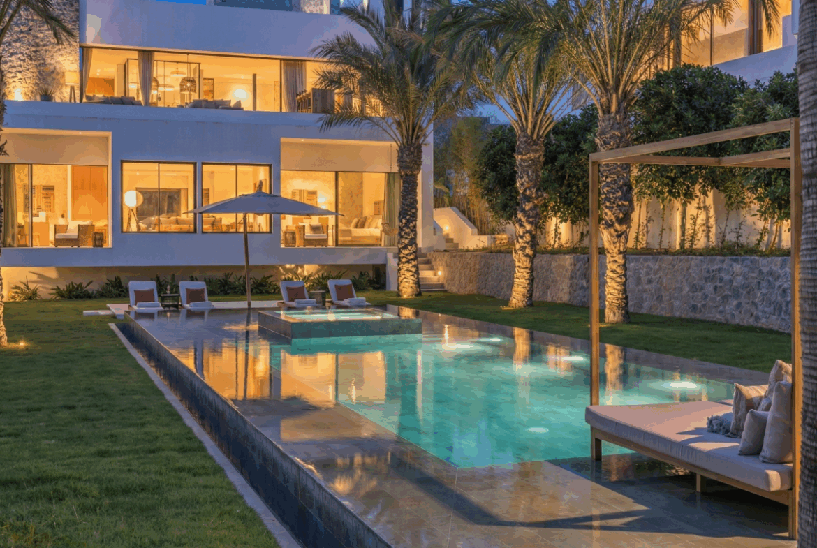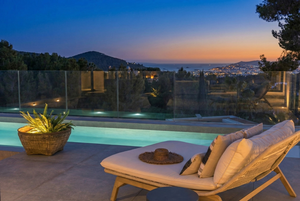 The surroundingsThis modern villa, designed by Blakstad, “Tauet” is located high on a hill with spectacular views of Dalt Vila in one of the island's most sought-after residential areas, Can Furnet. This tranquil neighborhood offers peace and privacy, yet is just minutes away from the charming town of Jesús where you can find all your daily necessities. This location offers a wide variety of choices when it comes to beachlife. The nearest beach is the wide, sandy beach of Talamanca, just an 8-minute drive away. Here you can spend a relaxing beach day in the picturesque bay and enjoy delicious al-fresco dining at scenic seaside restaurants. For a more tranquil and unspoilt beach experience, Cala Olivera, Cala Bonita and Cala Espart are all serene bays to enjoy the pristine coastal nature of the island, all within a 10-minute drive. Just within an 8-minute drive towards Ibiza Town, you will find the sophisticated area of Marina Botafoch with its famous marina, home to the world's most impressive superyachts. Stroll along the promenade and find luxury designer shops such as Louis Vuitton, Hermès and Dior. Also, you can enjoy culinary delights in the gourmet restaurants It, Roto, and STK, that lie next to Ibiza's iconic nightlife like Lío and Pacha. A few minutes further you will find yourself in the beating heart of the island, the vibrant Ibiza Town. This charming city is full of cultural heritage, extensive dining options, rooftop bars, a marina and a mix of both local boutiques and international retail stores. The airport is also easily accessible on just a 15-minute drive from this peaceful residence. This home offers the pinnacle of luxurious living close to all of Ibiza's main hotspots, whilst at the same time offering a serene and private living experience with unparalleled views.The villaThis exquisite newly-built villa harmoniously blends modern design with Balinese influences. The villa “Tauet” is an exceptional home that offers a warm and inviting atmosphere. A major highlight of this listing is the fully furnished handover, ready to move in straight away. Much attention has been given to the beautiful styling and overall interior design. Spanning 426m2 of built area on a 1404m2 plot, the villa is divided over 2 floors and features 5 generously sized bedrooms and 5 luxurious bathrooms. Enter this modern estate via a sleek staircase that leads to an impressive front door. As you step inside, you are greeted by a breathtaking squared glass window with a skylight that bathes the interior in natural light. From here you enter the main floor and find yourself in a large, open living and dining area with beautiful views of the lush surroundings through the large floor-to-ceiling windows. The modern and fully-equipped kitchen features a sophisticated kitchen bar, perfect for sipping your morning coffee or enjoying drinks with friends. From the living area you can access the adjoining balcony with a lounge and dining area offering great views over your alluring garden, creating the perfect setting for a seamless indoor and outdoor living experience. A modern staircase allows you to reach the different levels of the house. The spacious bedrooms with their own luxury ensuite bathrooms are all located on the lower floors. The master bedrooms offer stunning views over the peaceful tropical garden. In addition, they each have their own private balcony overlooking the giant pool. Awaken here every single day in your very own peaceful paradise with zen surroundings. The remaining bedrooms also feature luxe en suite bathrooms and private terraces, offering privacy and relaxation.The outdoor spacesThe villa features an immaculate tropical garden, perfect for outdoor entertaining. Find a large, elegant Bali-style overflow swimming pool complete with an integrated jacuzzi as the centerpiece of the garden. The pool area is surrounded by a well-maintained green lane and tropical palm trees, creating a perfect spa-like outdoor atmosphere. Multiple relaxation areas abound, including sun loungers, a Bali bed, an integrated lounge area. In addition to the serene and secluded garden, the villa also offers elevated outdoor spaces with breathtaking views. The upper floor features an expansive terrace with panoramic vistas stretching to Dalt Vila. The crown jewel of the villa's outdoor spaces, is an impressive rooftop terrace with a second infinity pool. Host exclusive dinner parties with stunning views or enjoy cocktail soirees under the stars for unforgettable nights. This remarkable rooftop deck offers privacy, million-dollar views and total relaxation. Ensuring your safety and security, the property is fully fenced. This dream villa epitomizes luxury living, seamlessly blending modern sophistication with the tranquility of nature, creating an unparalleled very exclusive living experience.