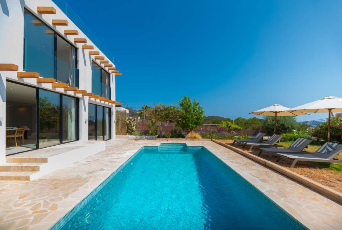 An exclusive villa in one of Ibiza’s most sought-after locationsIn the heart of the prestigious Cap Martinet district, on the east coast of Ibiza, lies Can Pont – a modern dream villa that perfectly embodies the island’s lifestyle: luxury, light, and openness. Cap Martinet is considered one of the island’s most exclusive residential areas, loved by celebrities, design enthusiasts, and people who value peace and privacy. The location is unique: just a few minutes away are Marina Botafoch, the beaches of Talamanca and S’Estanyol, and Ibiza’s Old Town. Yet, here you can enjoy complete tranquility, surrounded by Mediterranean nature and breathtaking sea views. This combination of privacy, central location, and natural beauty makes Cap Martinet one of the most desirable places in Ibiza.Architectural masterpiece in Blakstad style with thoughtful interiorCompleted in May 2025, Can Pont impressively combines traditional architecture with state-of-the-art comfort. The home is entirely new and was planned from the beginning with the highest quality in mind – in the authentic style of the renowned Blakstad architecture. With around 412 m² of living space, the house offers five spacious bedrooms and six stylish bathrooms and guest WCs, four of them en suite. The open living room with large double-glazed sliding doors is bright and seamlessly connects to the terrace. The newly designed kitchen is a real eye-catcher: custom-made with a side-by-side fridge-freezer, a large wine cooler, a Siemens StudioLine downdraft extractor with matching induction hob, and a 90 cm oven – all perfectly integrated into a sleek modern design. All furniture is new, including the washer, dryer, and all technical equipment. The entire living area has underfloor heating and additional radiators, powered by a new oil and electric heating system. Each room has air conditioning for both cooling and heating. A separate laundry room, wine cellar, safe, high-speed fiber internet, and Sonos sound system indoors and outdoors highlight the property’s premium quality.A garden to enjoy – pool, terraces and Mediterranean landscapingThe approximately 780 m² plot is beautifully landscaped with olive trees, fruit trees, and cypresses. An automatic irrigation system makes maintenance easy. The garden is completely enclosed and offers full privacy. The outdoor highlight is the large 30 m² pool with an adjacent heated outdoor shower. Various sunny and shaded terraces invite relaxation – perfectly complemented by a fully equipped outdoor kitchen with BBQ grill and traditional wood-fired oven, ideal for Mediterranean evenings with friends. The spectacular rooftop terrace with 180-degree panoramic views of the sea, Dalt Vila, and even Formentera is perfect for unforgettable sunsets. A jacuzzi can be optionally integrated. Additional features include a double garage with covered direct access to the house, a modern video surveillance system, and an alarm system connected to a security company. The house not only offers exceptional living comfort but also expansion potential. The already-prepared basement can be converted on request into a wellness area with sauna and gym – this option can be realized upon request. Shops, cafés, and popular restaurants in Jesús are within walking distance – whether for a quick breakfast, a relaxed lunch, or an elegant dinner. The proximity to the city, combined with peace, quality, and spectacular views, makes Can Pont a unique place for anyone looking for a modern home with soul in Ibiza.