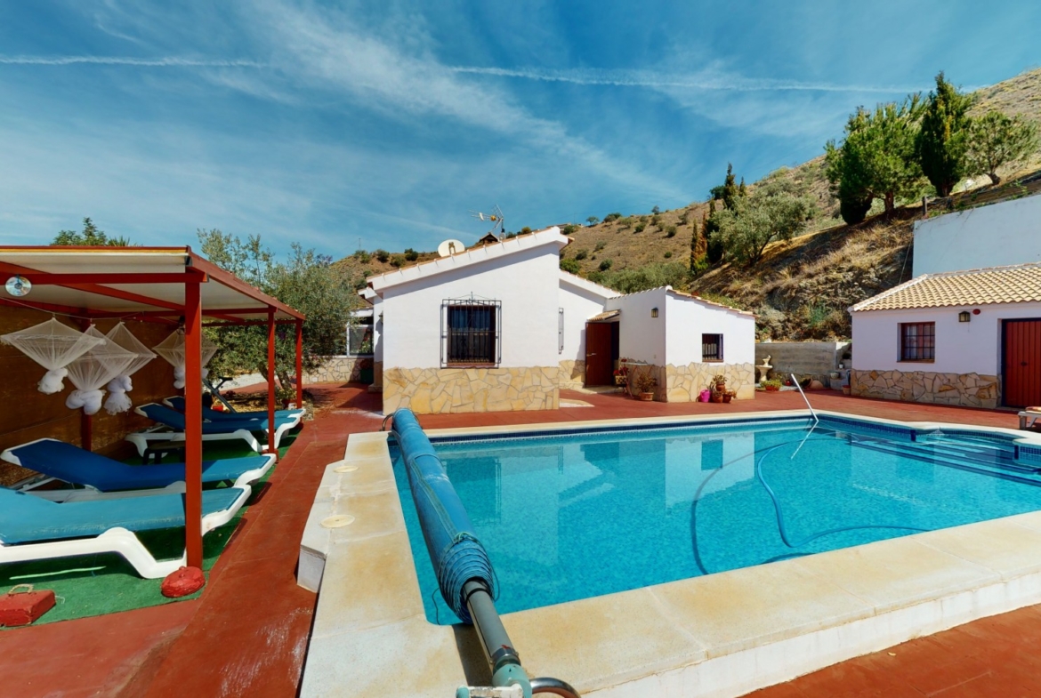 Beautiful country house, with absolute privacy and spectacular views of the town, the countryside and the mountains, located five minutes from the town of El Borge. It has more than four hectares of land with olive trees, mangoes and vines. It has two large water tanks, one with 3,000L capacity and another one with 100,000L. In the outdoor area there is parking space for more than three vehicles, a pool with sun loungers, a bathroom and barbecue and it also has a small house, that could be made into a separate guest apartment. In the main house we find a large kitchen with a dining room, a spacious living room with a fireplace and an winter garden. There are also two bedrooms and a room, that could be used as another bedroom. One would just have to add a door. A separate guest apartment with an bathroom on-suite is located right next to the main house. The house is licensed for rural rentals and produces interesting annual benefits. This is a perfect home for residential use or as an investment. We are pleased to be able to present this dream property to you soon, either personally or via virtual viewing. Because this world, it is unique - just like our Axarquía. In Andalusia. On the Costa del Sol. Here, on the sunny side of life...