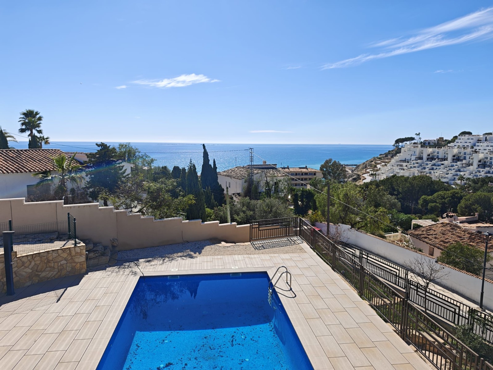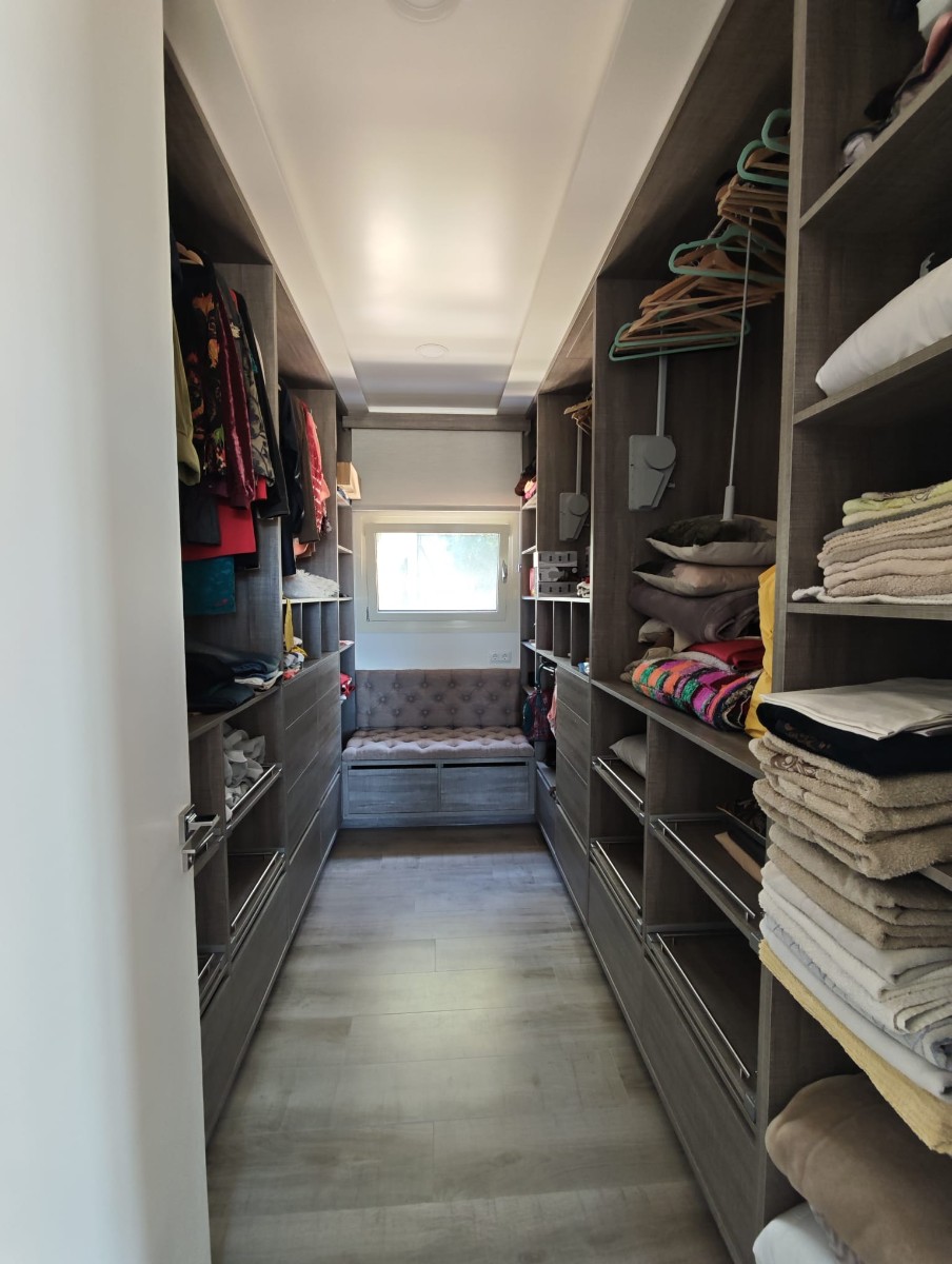 Outside, the villa features a private swimming pool surrounded by generous terraces and outdoor areas, ideal for relaxing and enjoying the Mediterranean climate. The 1,000 m² plot provides space and privacy while still being close to the sea.