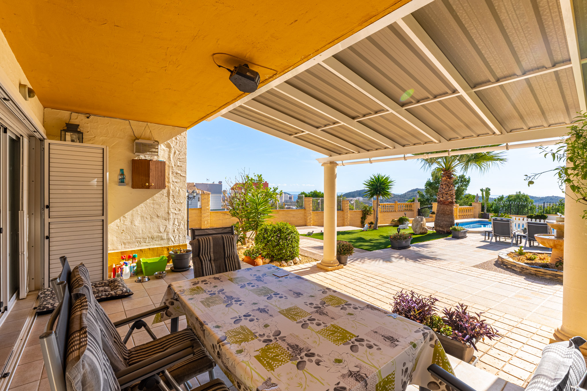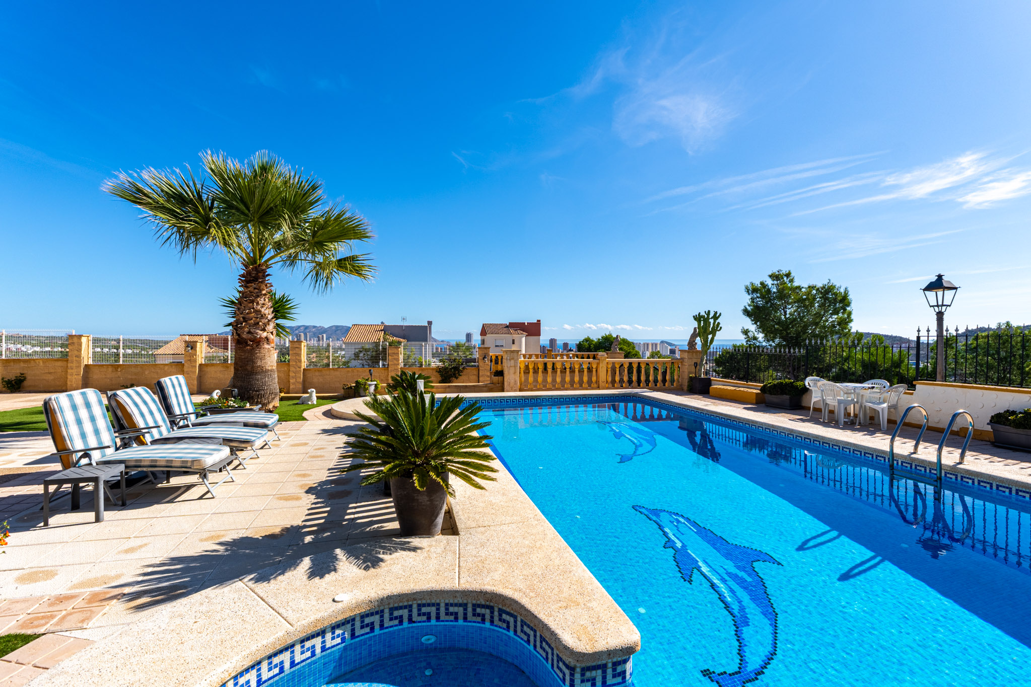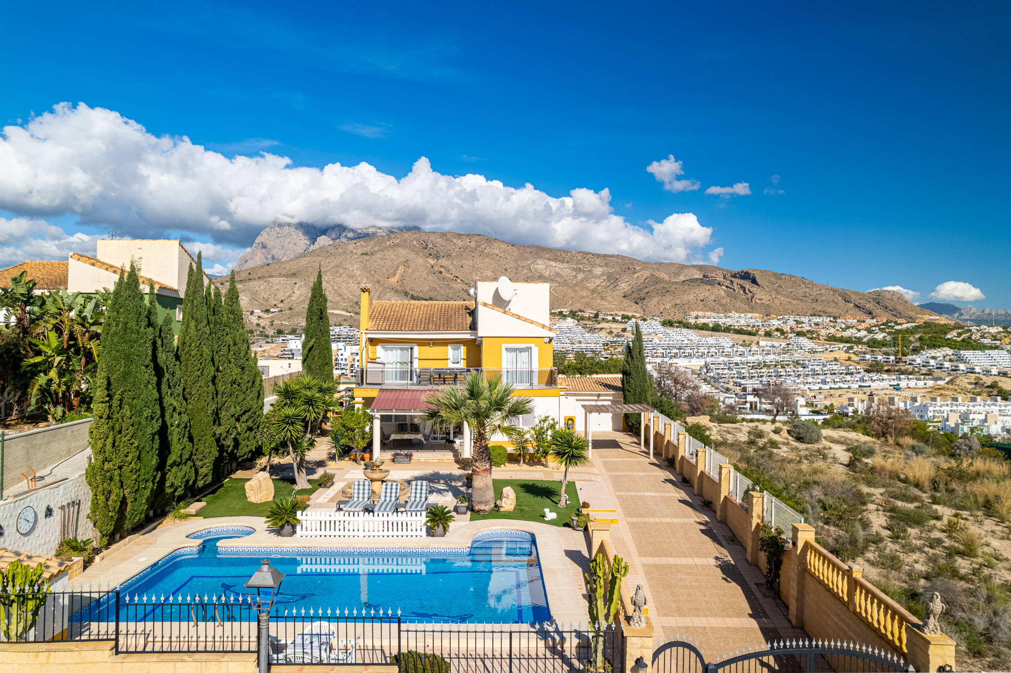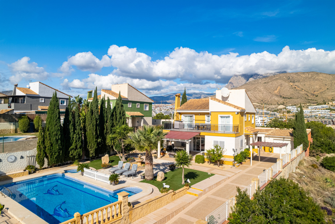 We are delighted to present this exceptional detached villa, perfectly situated in a peaceful area of Finestrat, just moments from the renowned La Marina shopping center. The location combines tranquility with convenience, while the property’s elevated position ensures uninterrupted sea and mountain views, with no future construction permitted in front.